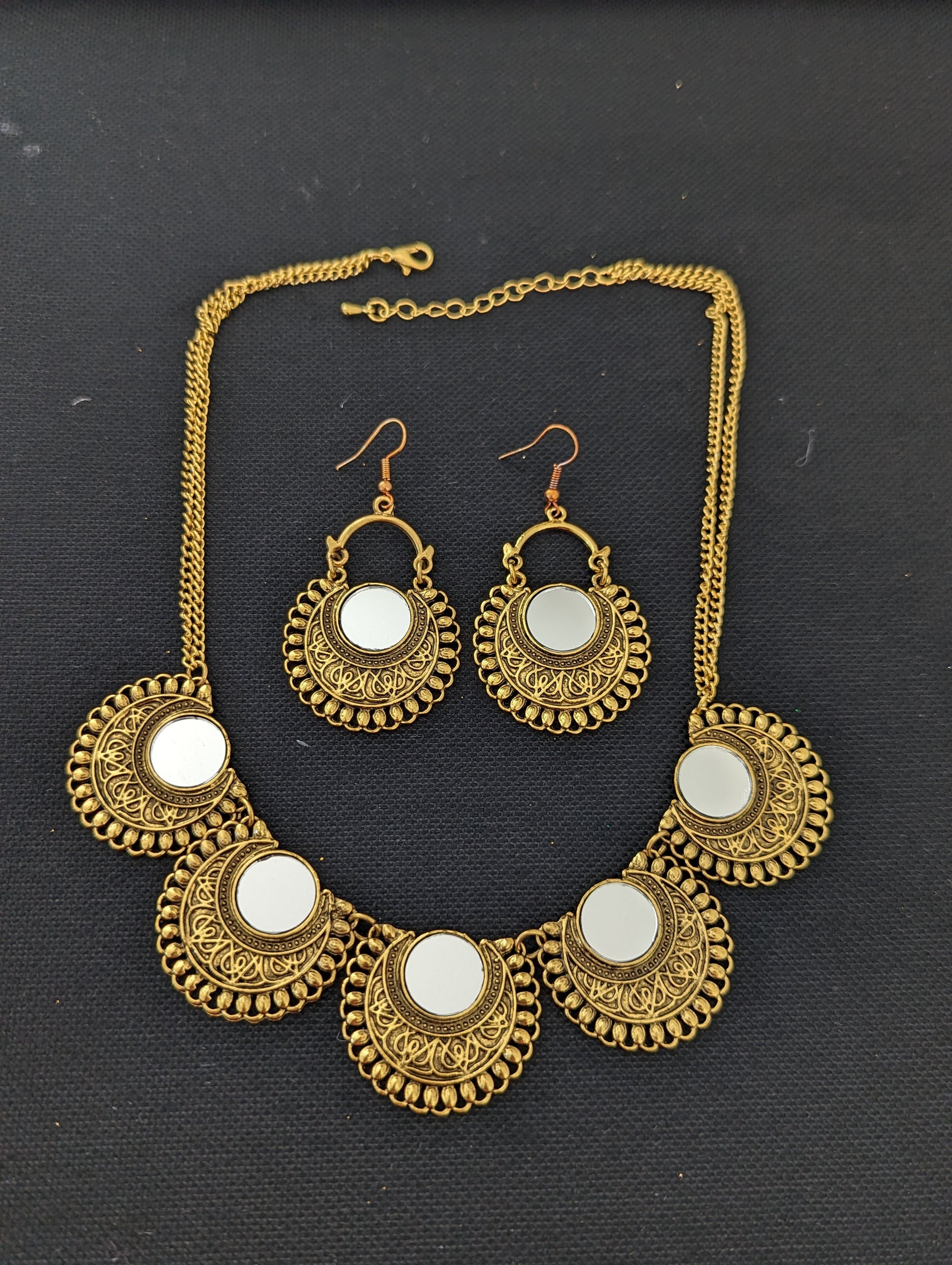 Antique gold finish mirror pasted chain necklace and earring set.
