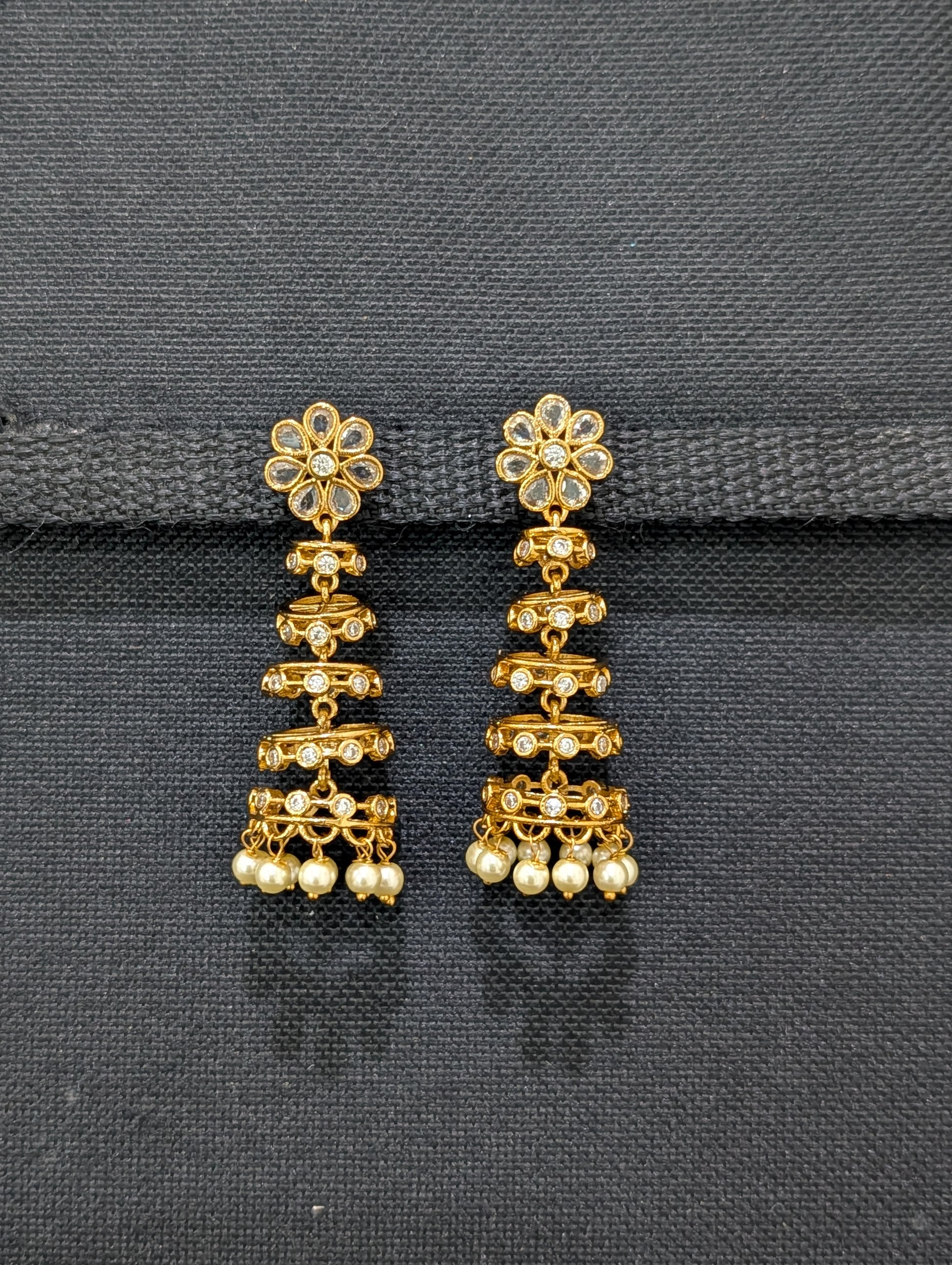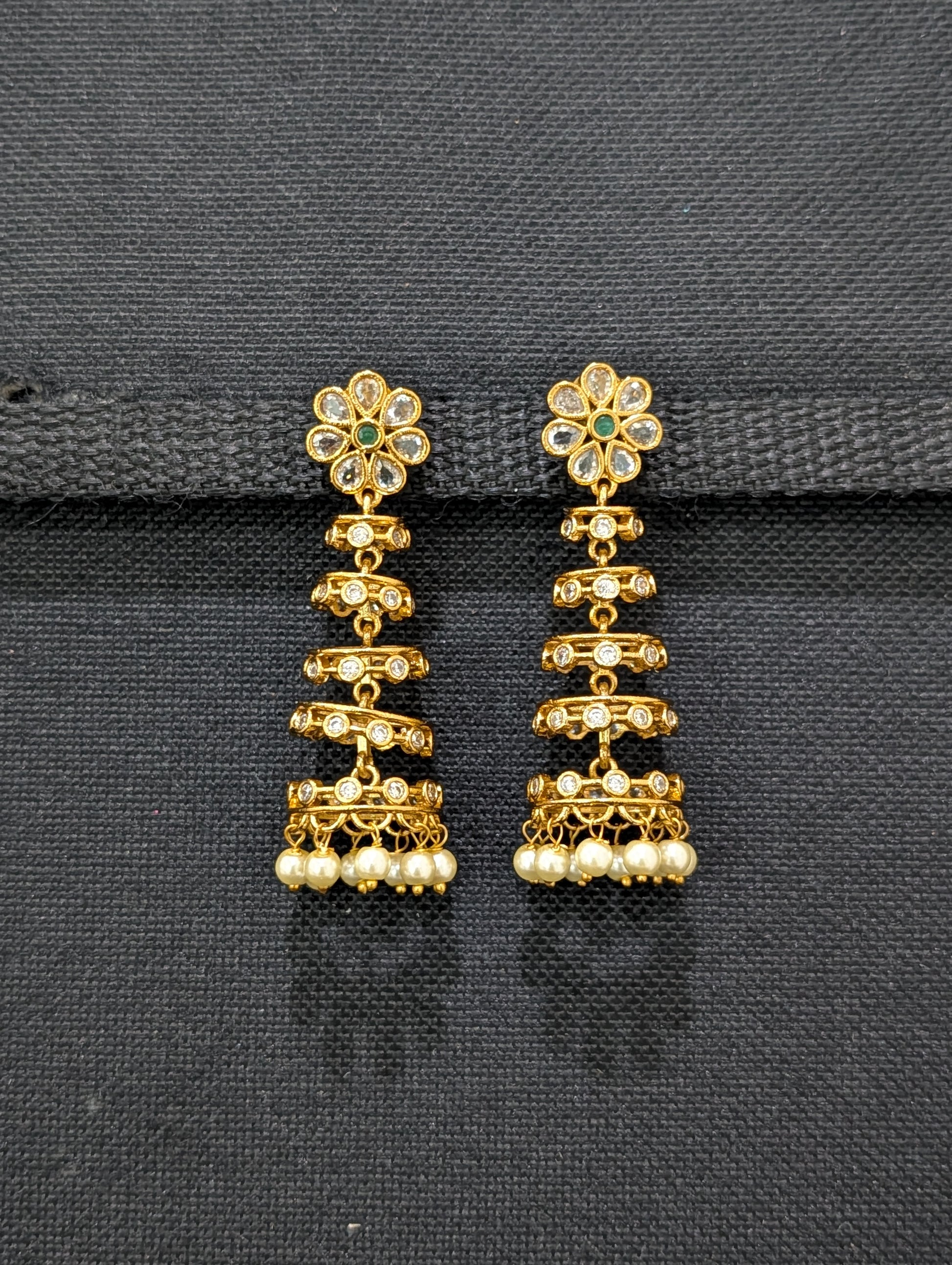 Ruby Green White CZ stone embedded pearl bead dangle jhumka.