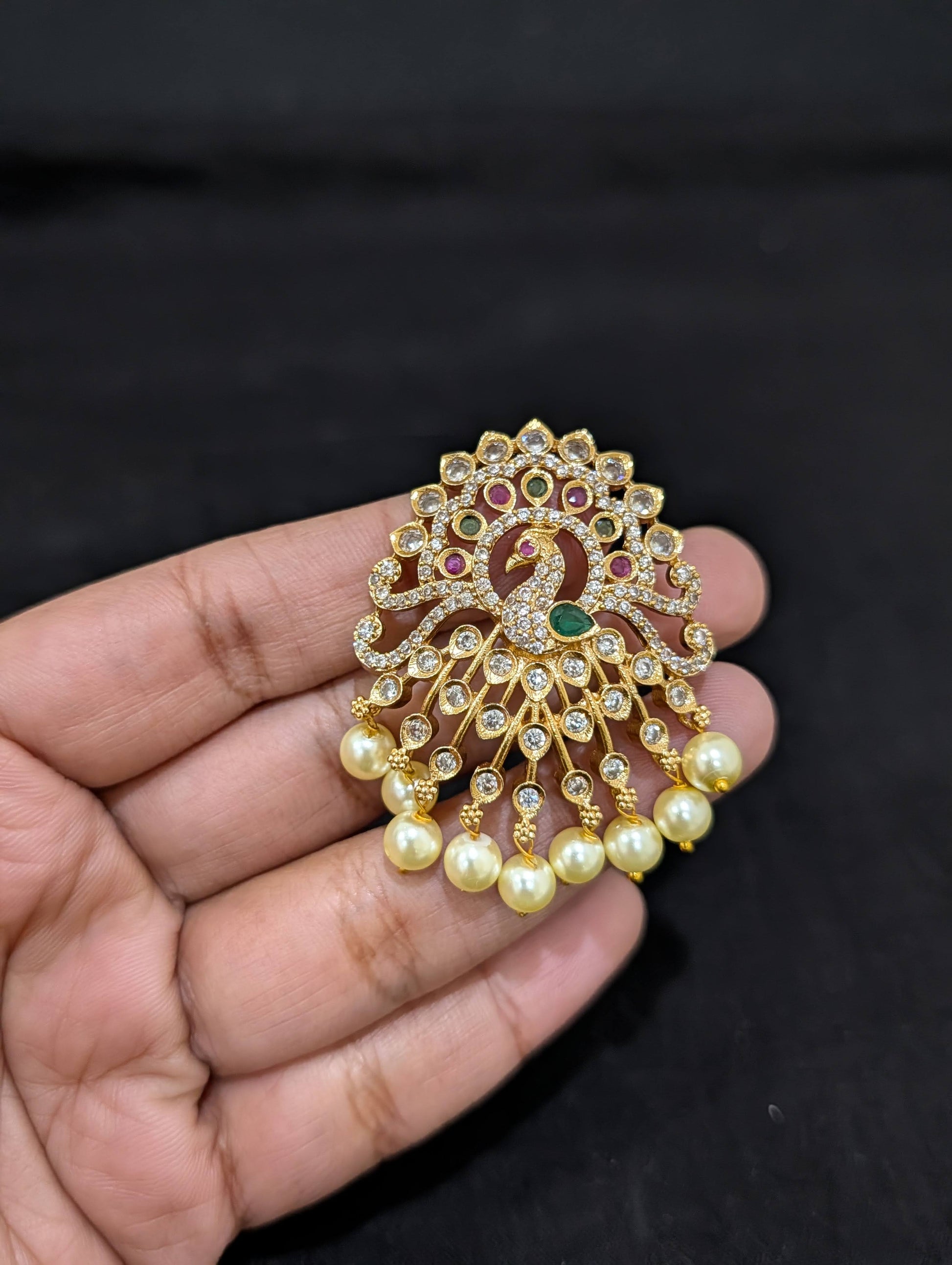 Ruby White Green CZ stone pasted pearl bead dangle hair brooch.