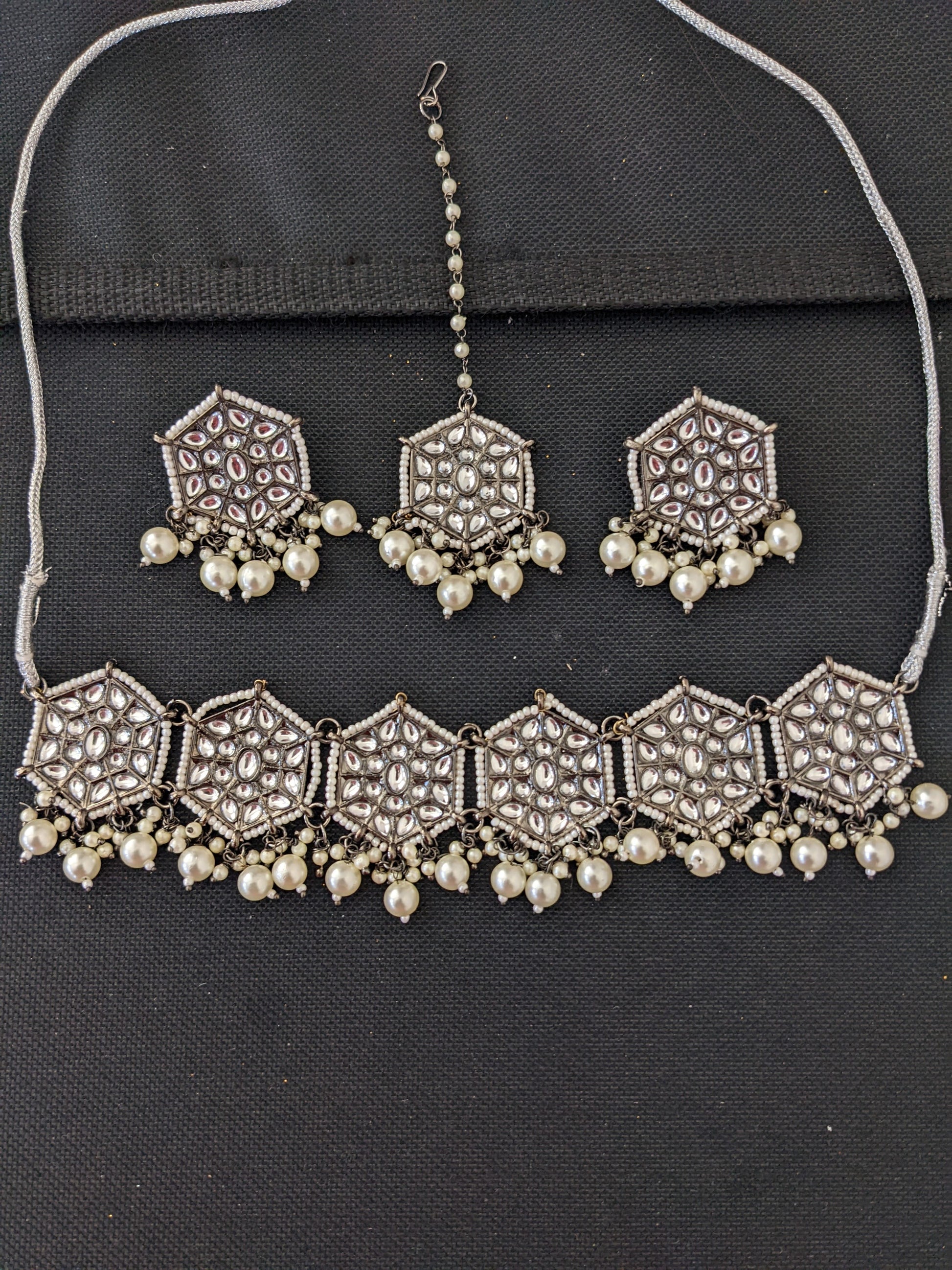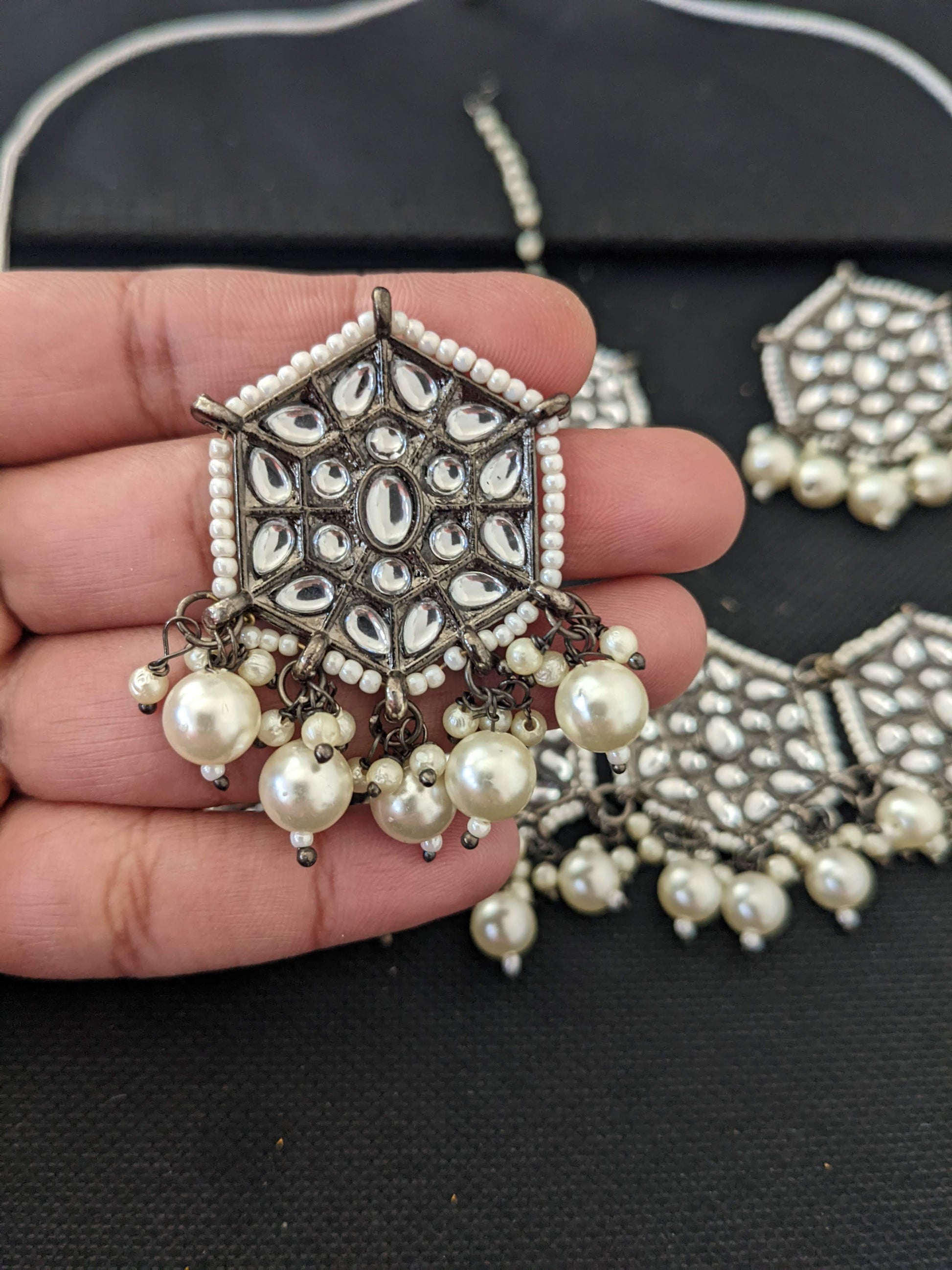 Glass kundan pasted pearl bead dangle necklace set.