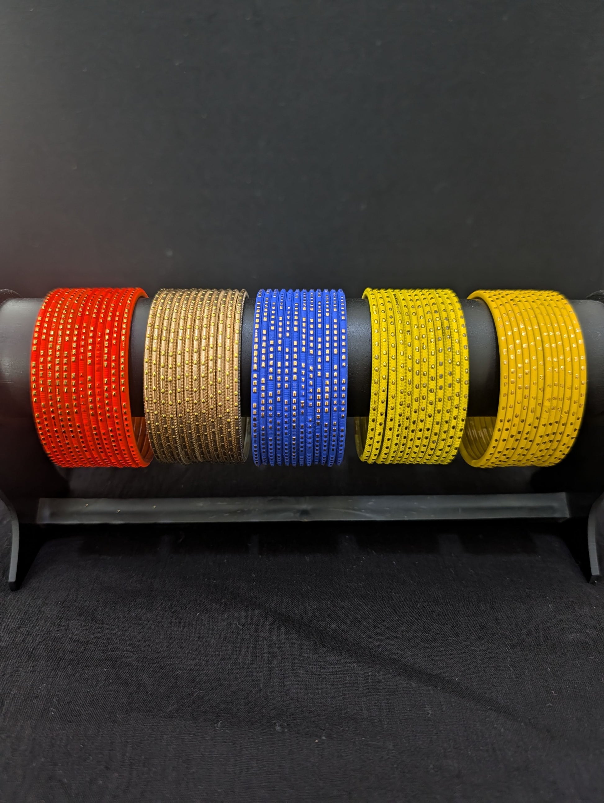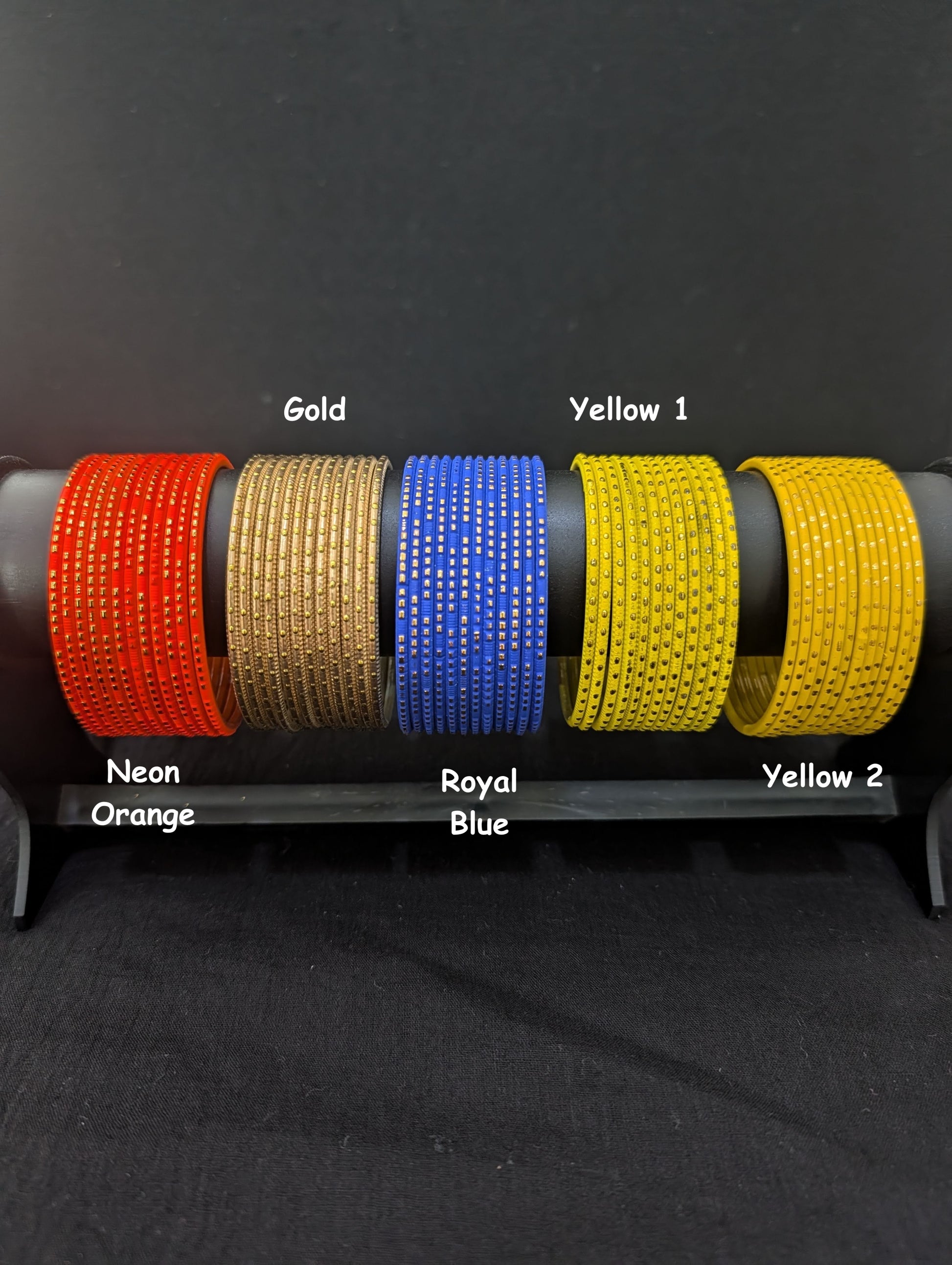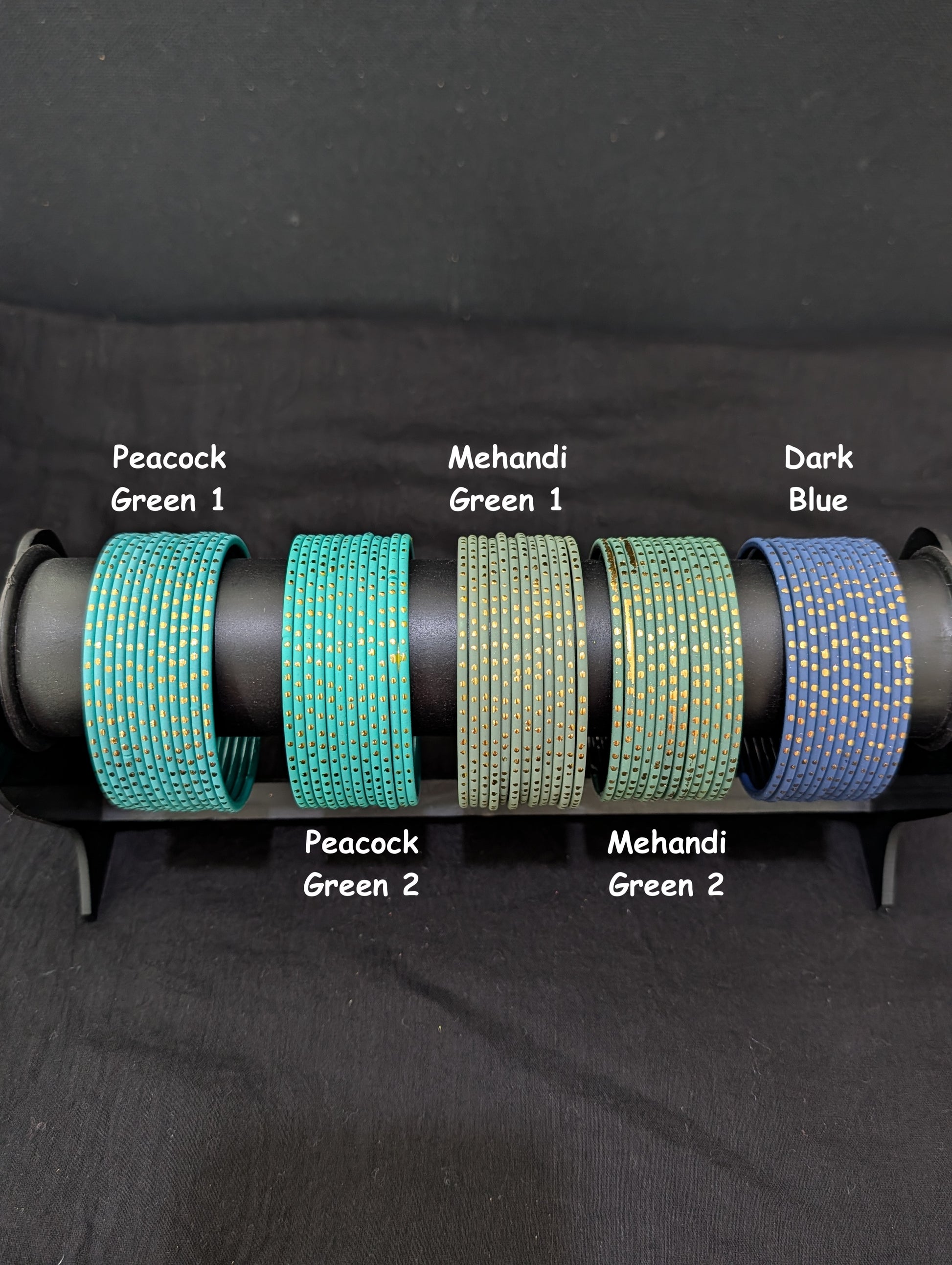 Matte finish top with gold dot and with shiny inner finish colorful bangles.