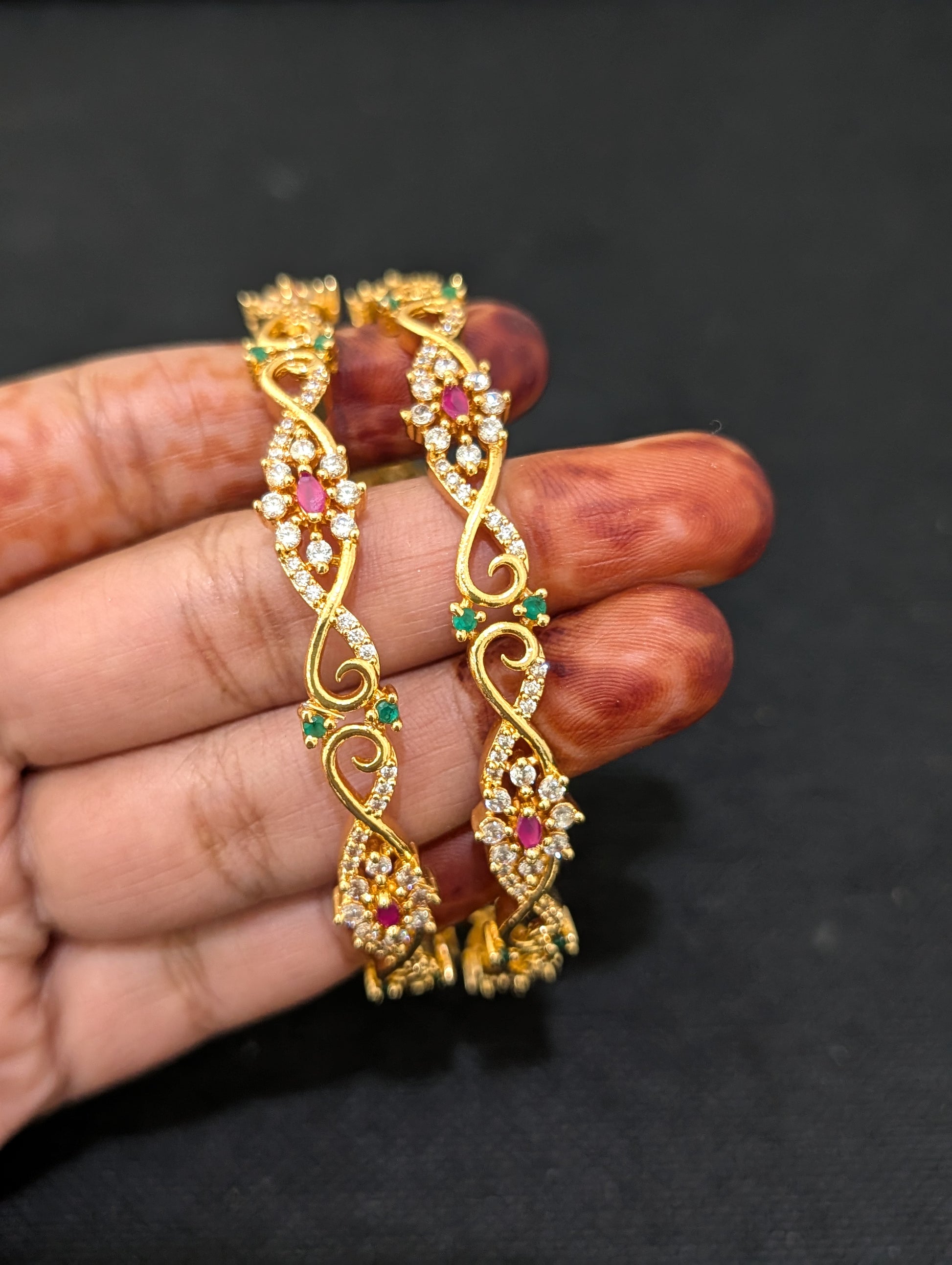 Ruby Green White CZ stone embedded one gram gold polished bangles.