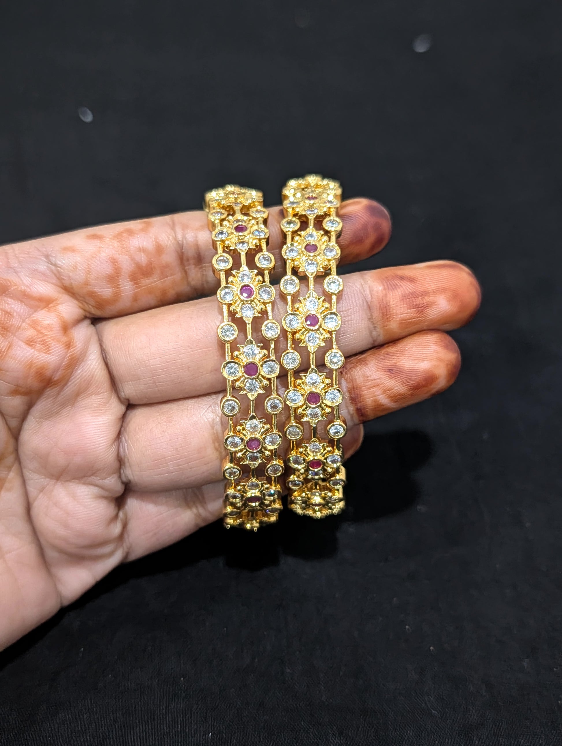 Dual line Flower CZ one gram gold polished bangles - Ruby