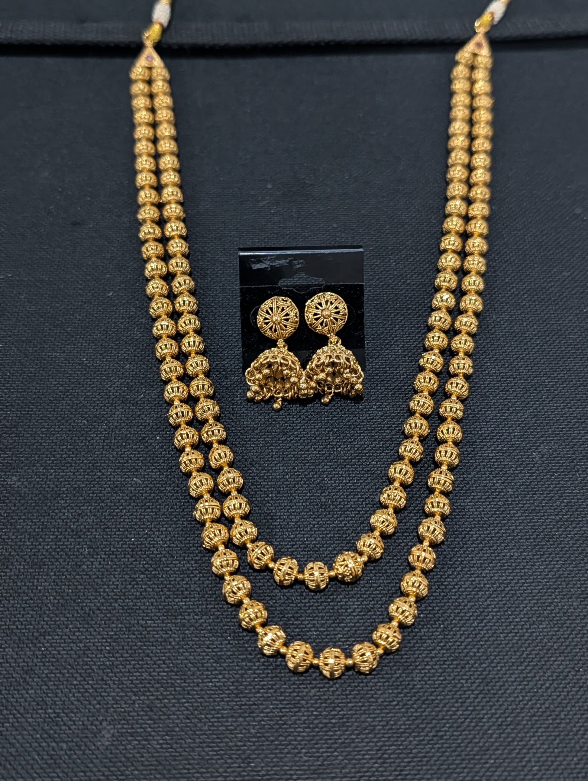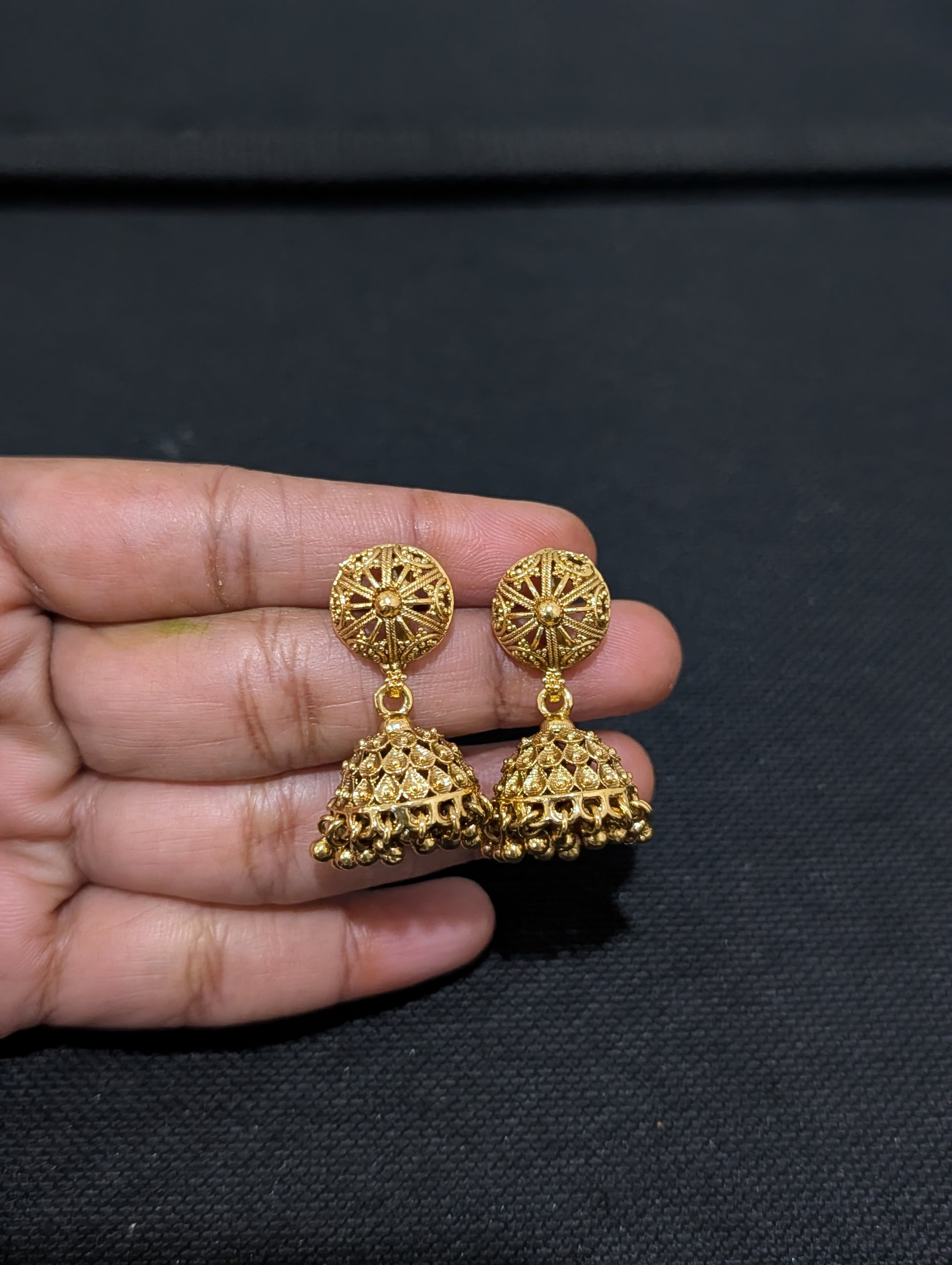 Gold plated mid length chain necklace and small jhumka earrings set.