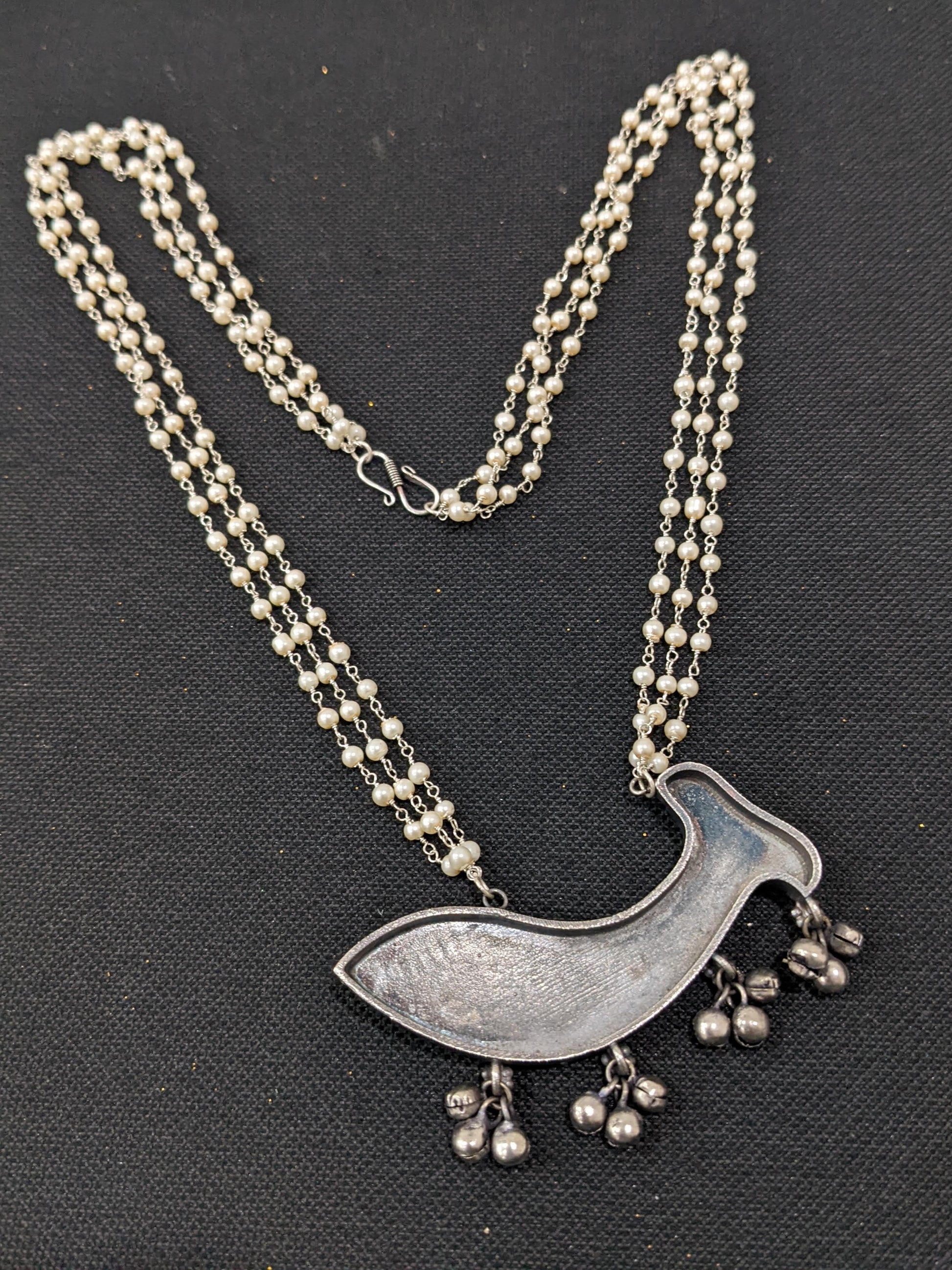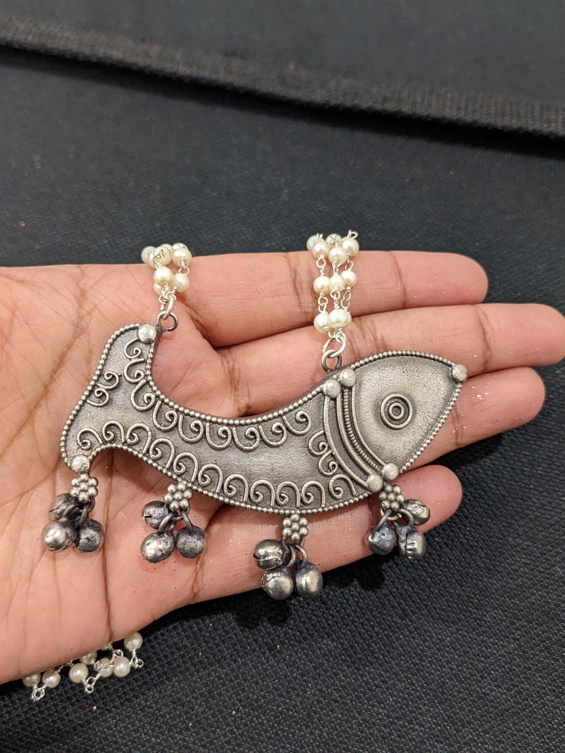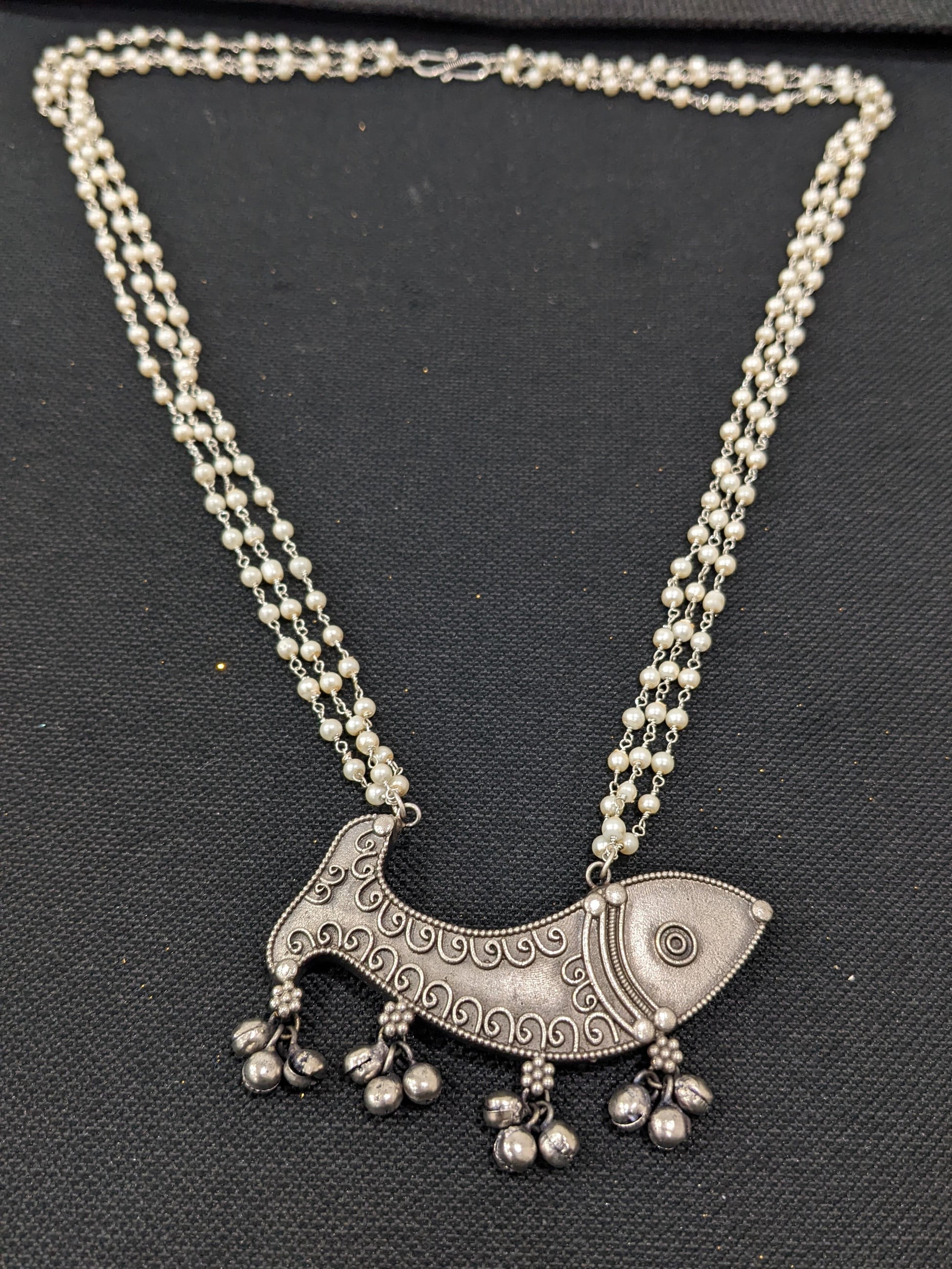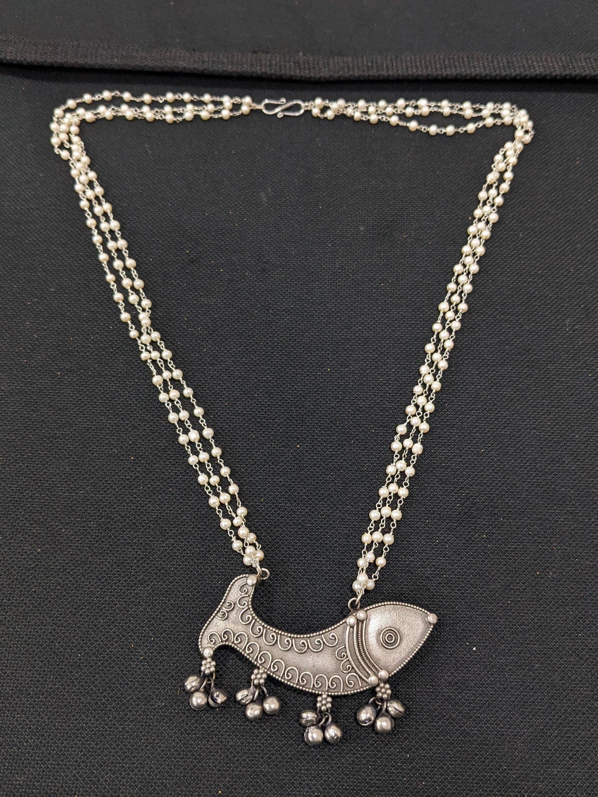Fish Pendant Pearl Chain Oxidized Silver Necklace