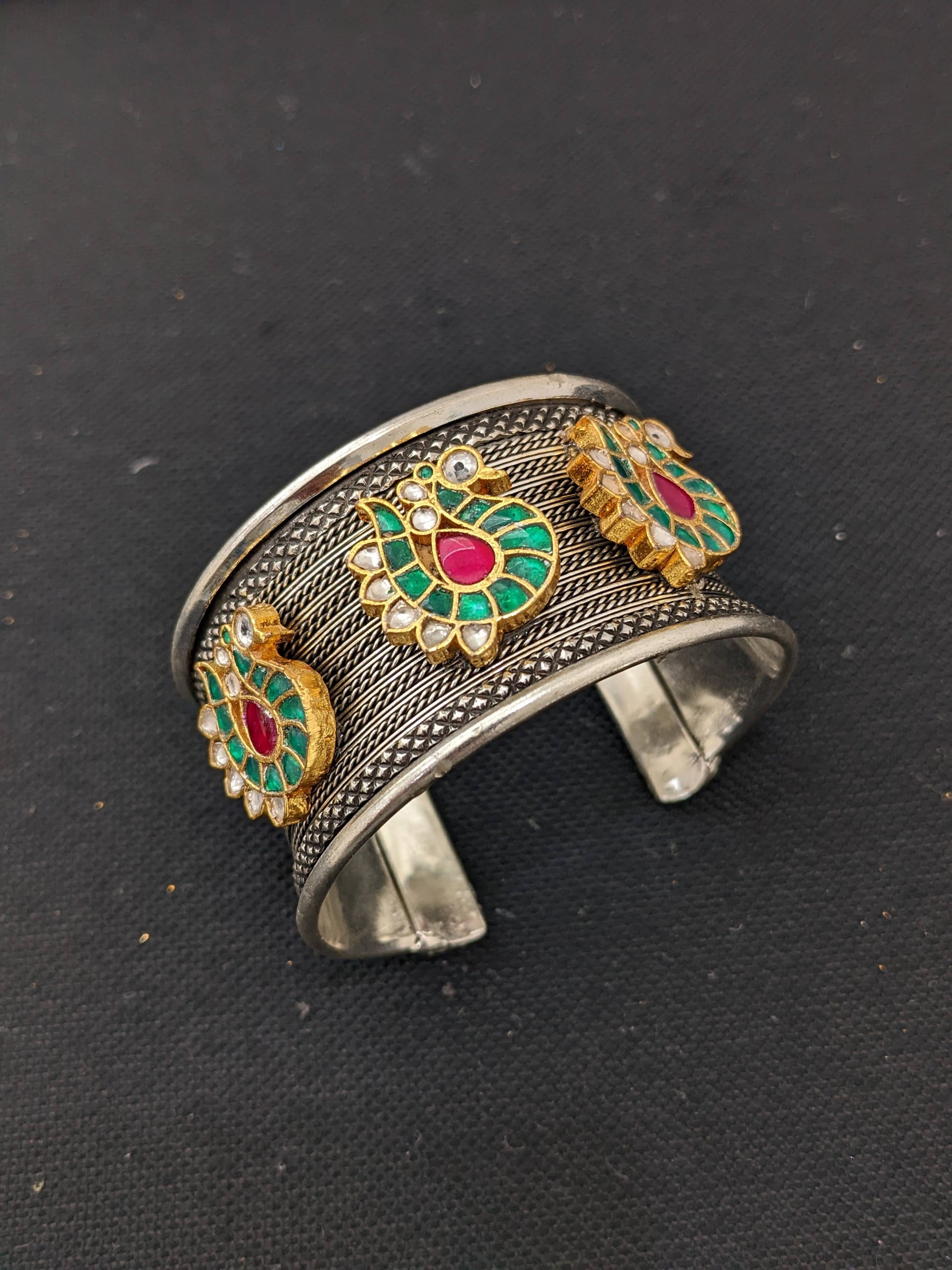 Jadau kundan stone pasted dual tone oxidized silver cuff bracelet.
