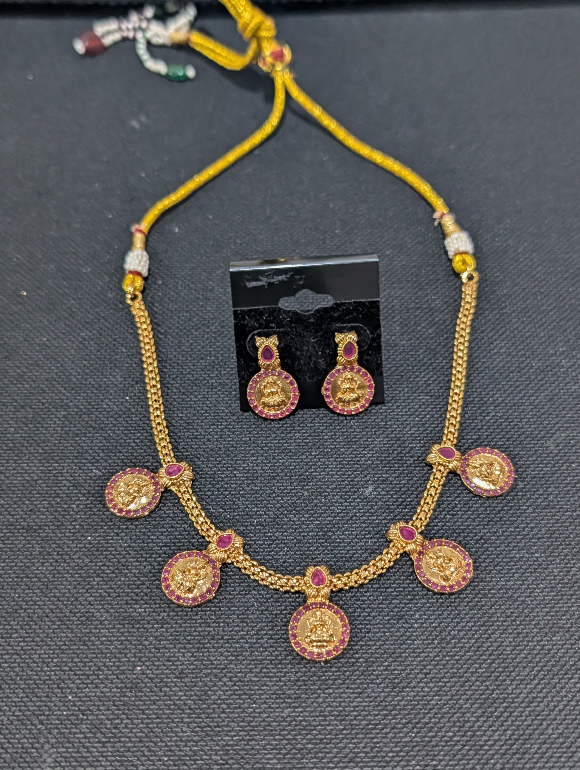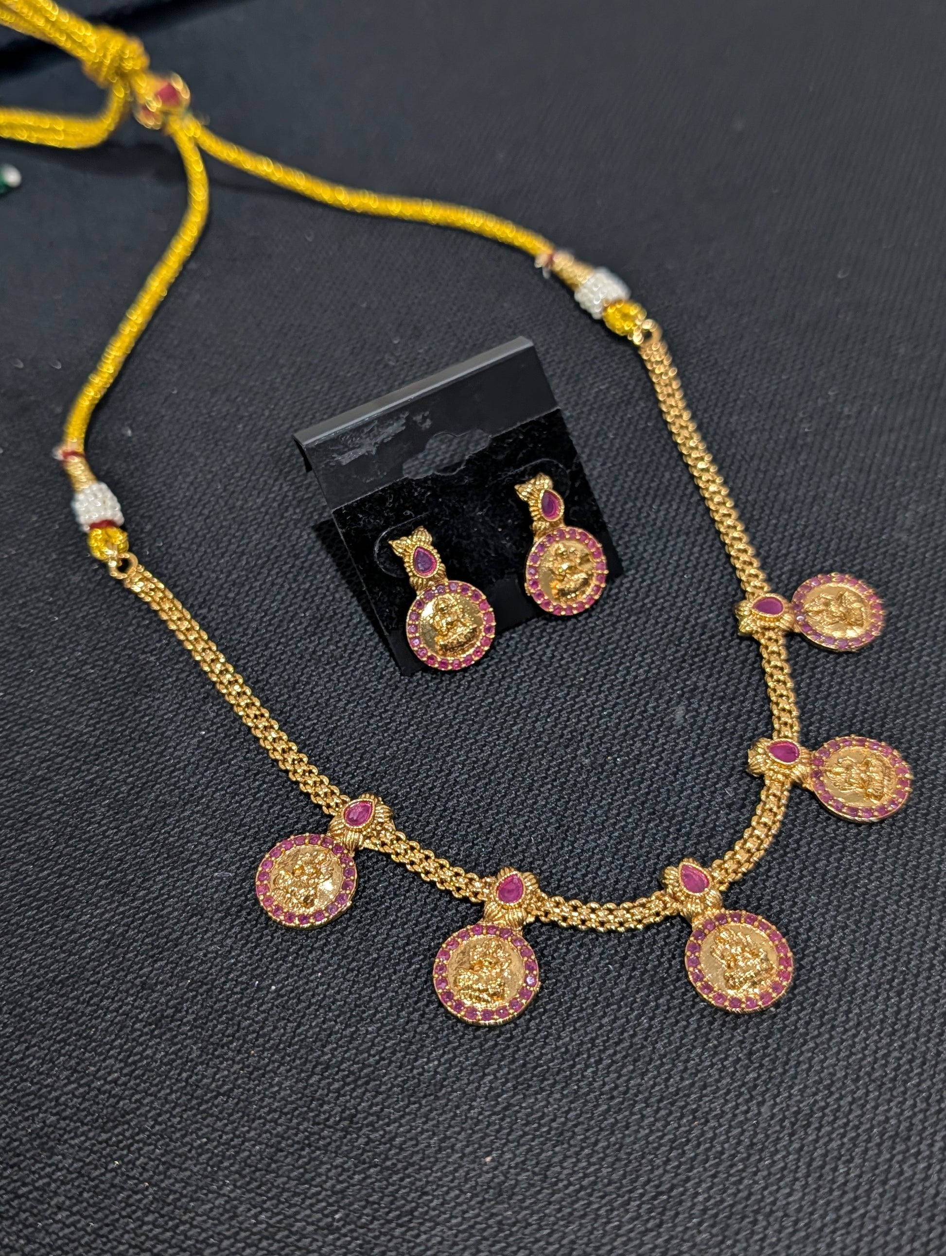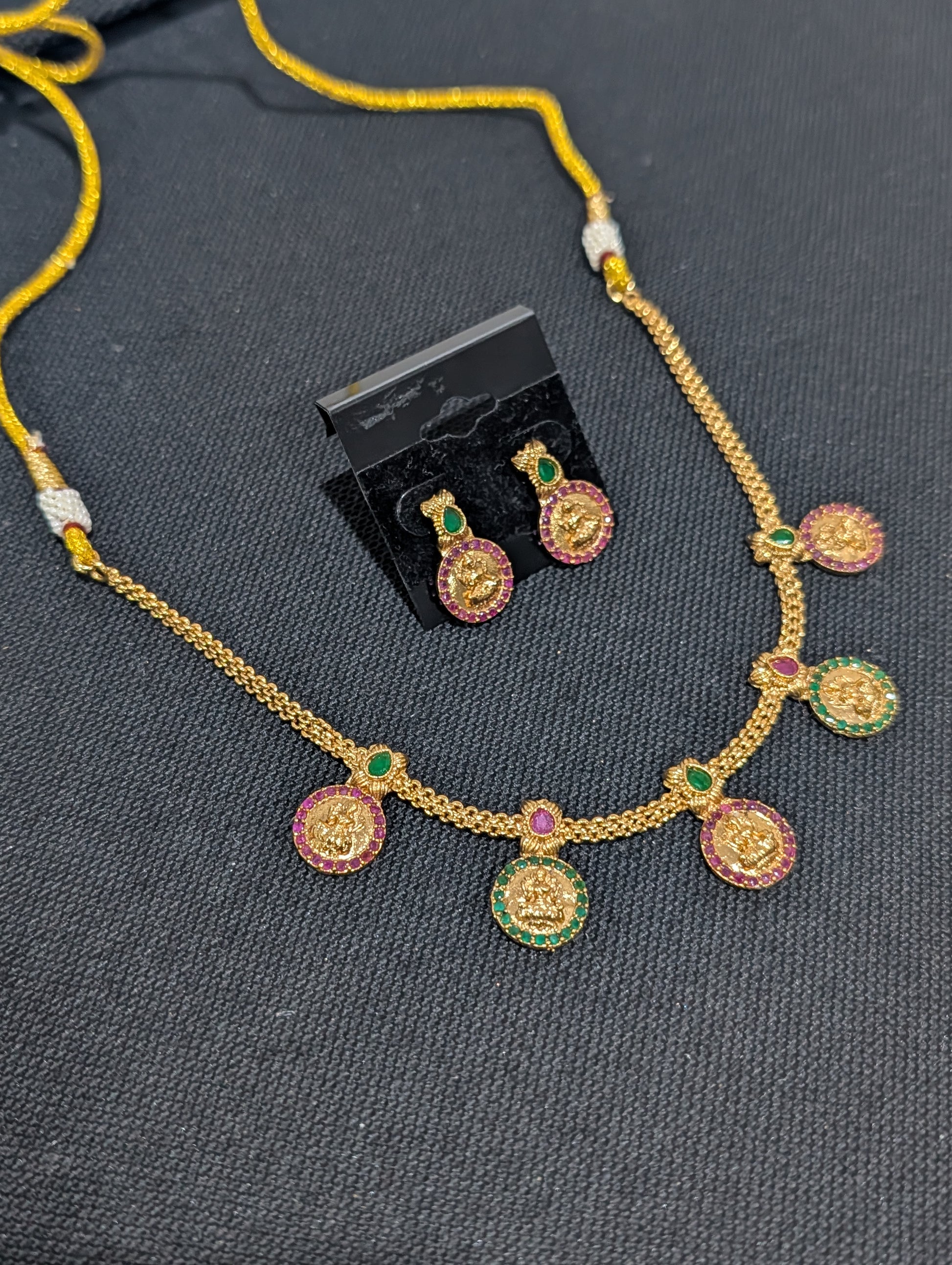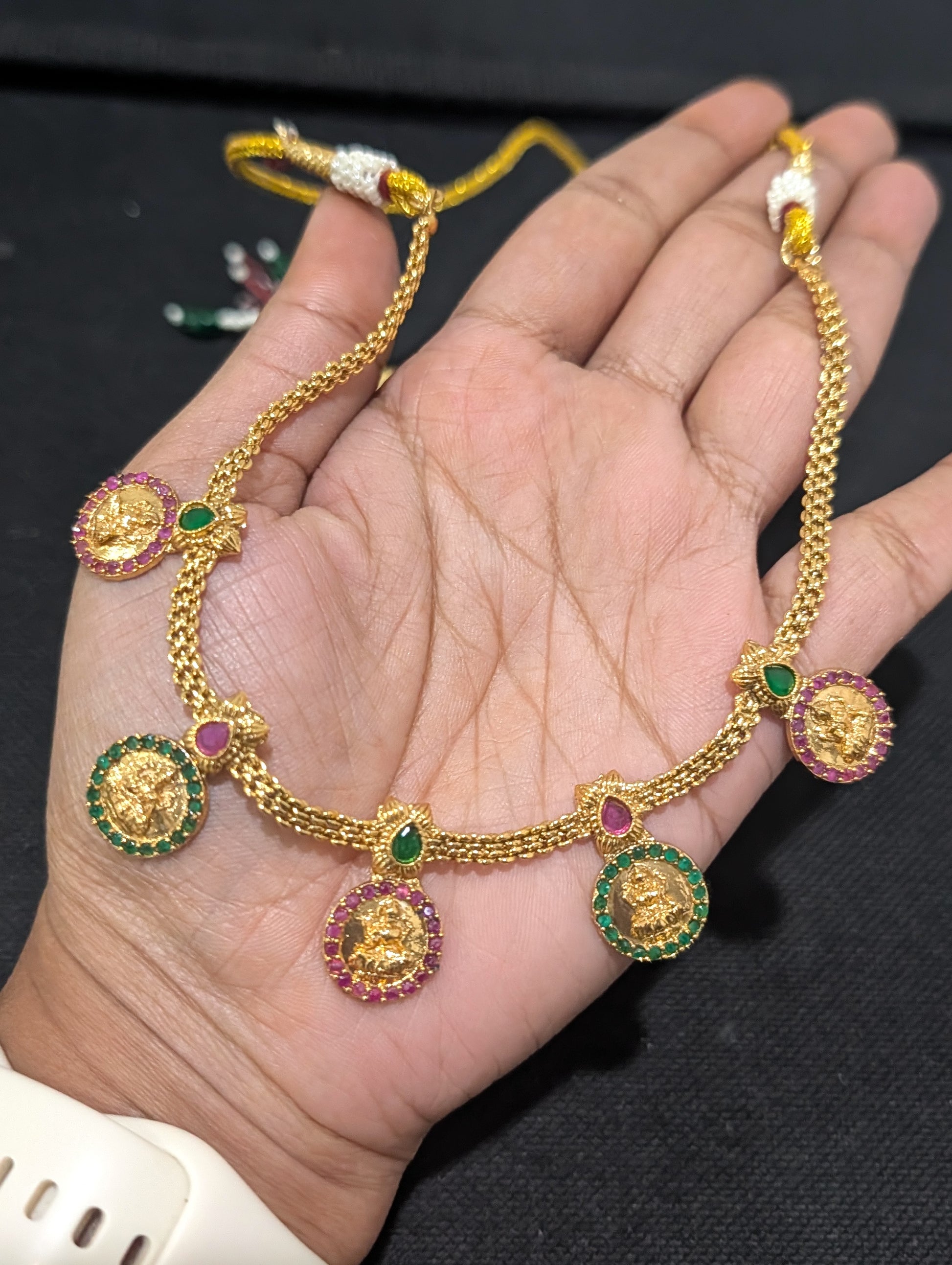 Gold plated Traditional Goddess Lakshmi Round charm design Choker and Stud Earrings set.