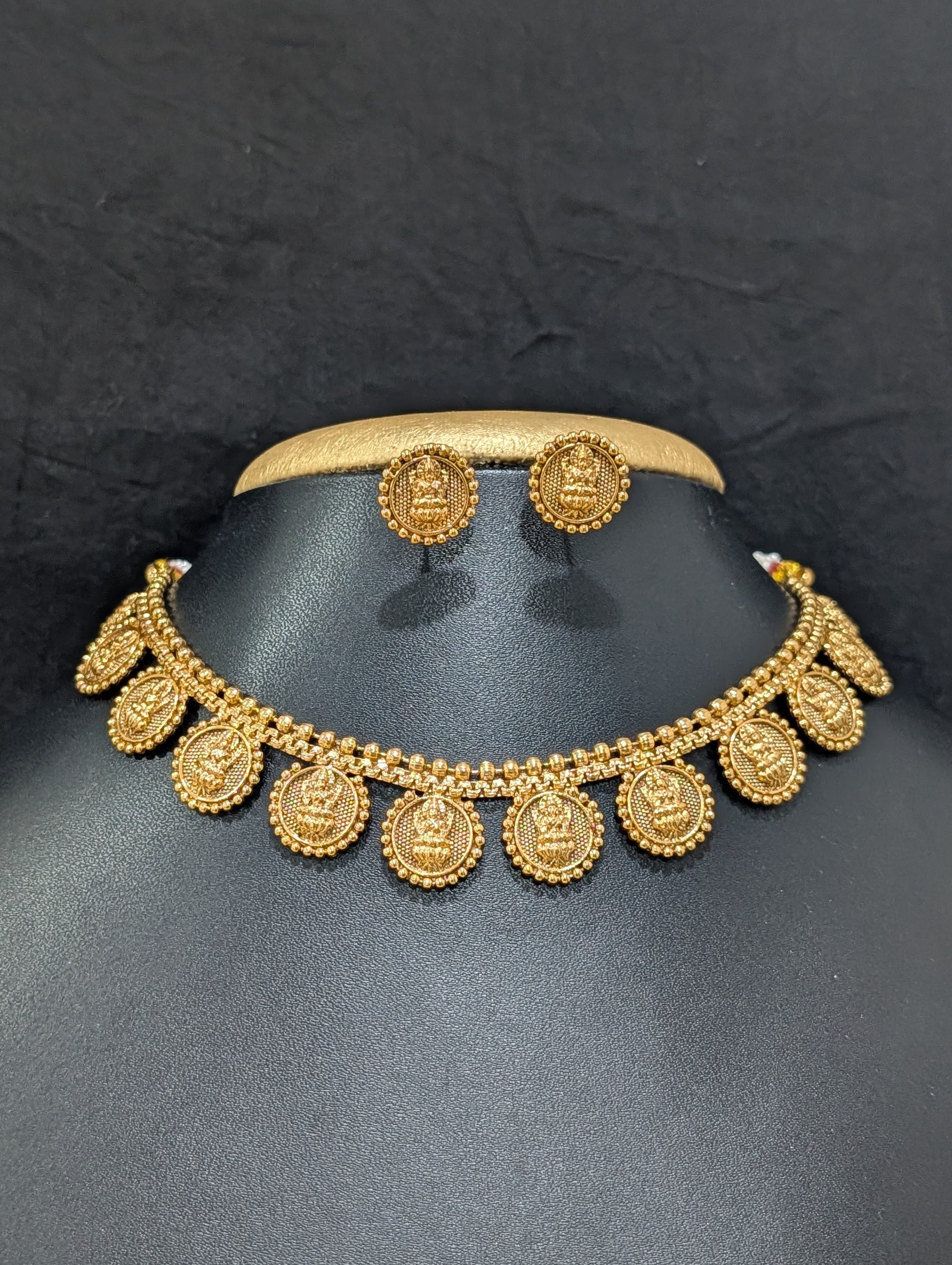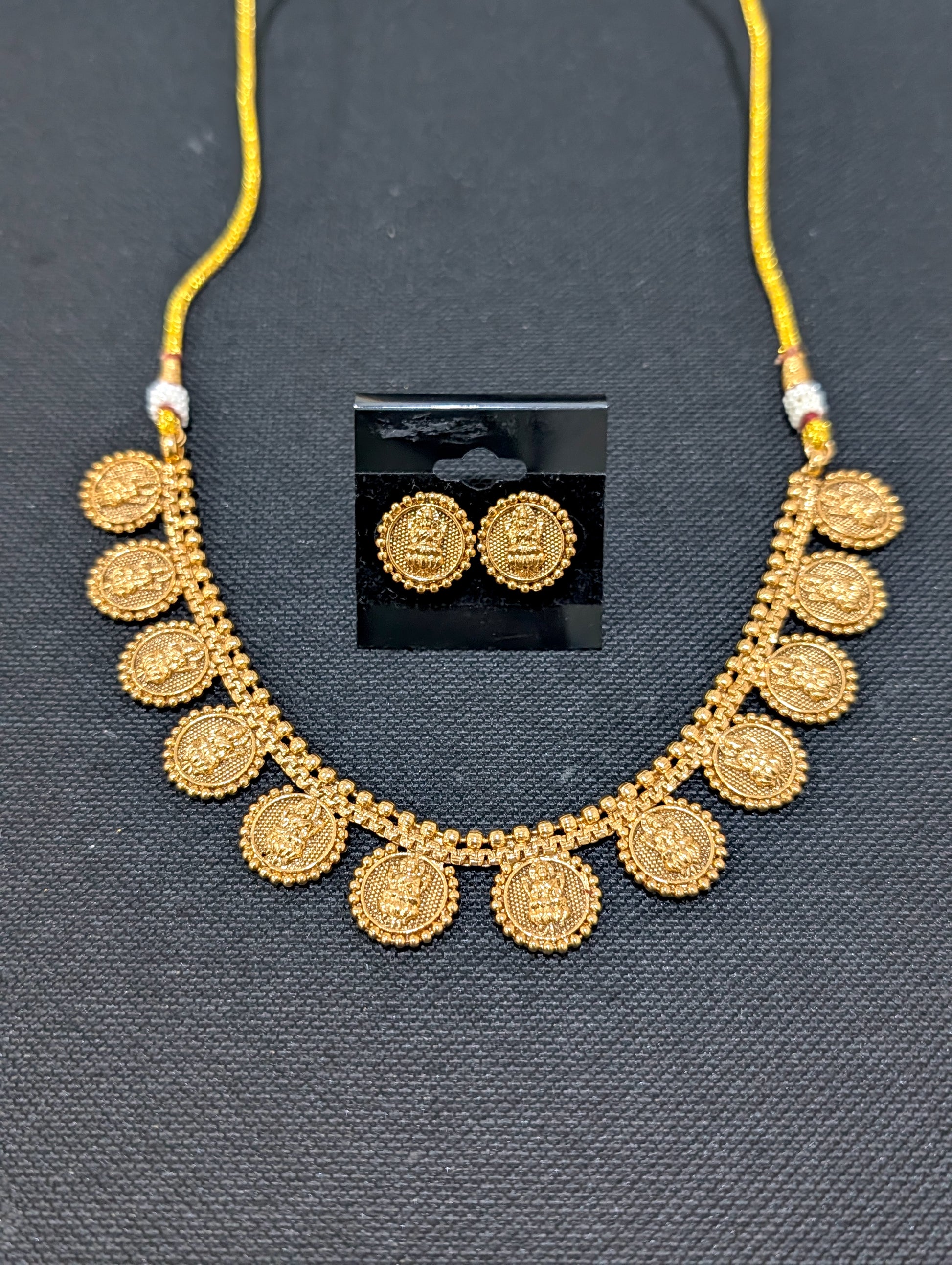 Gold plated Traditional Goddess Lakshmi Round charm design Choker and Stud Earrings set.