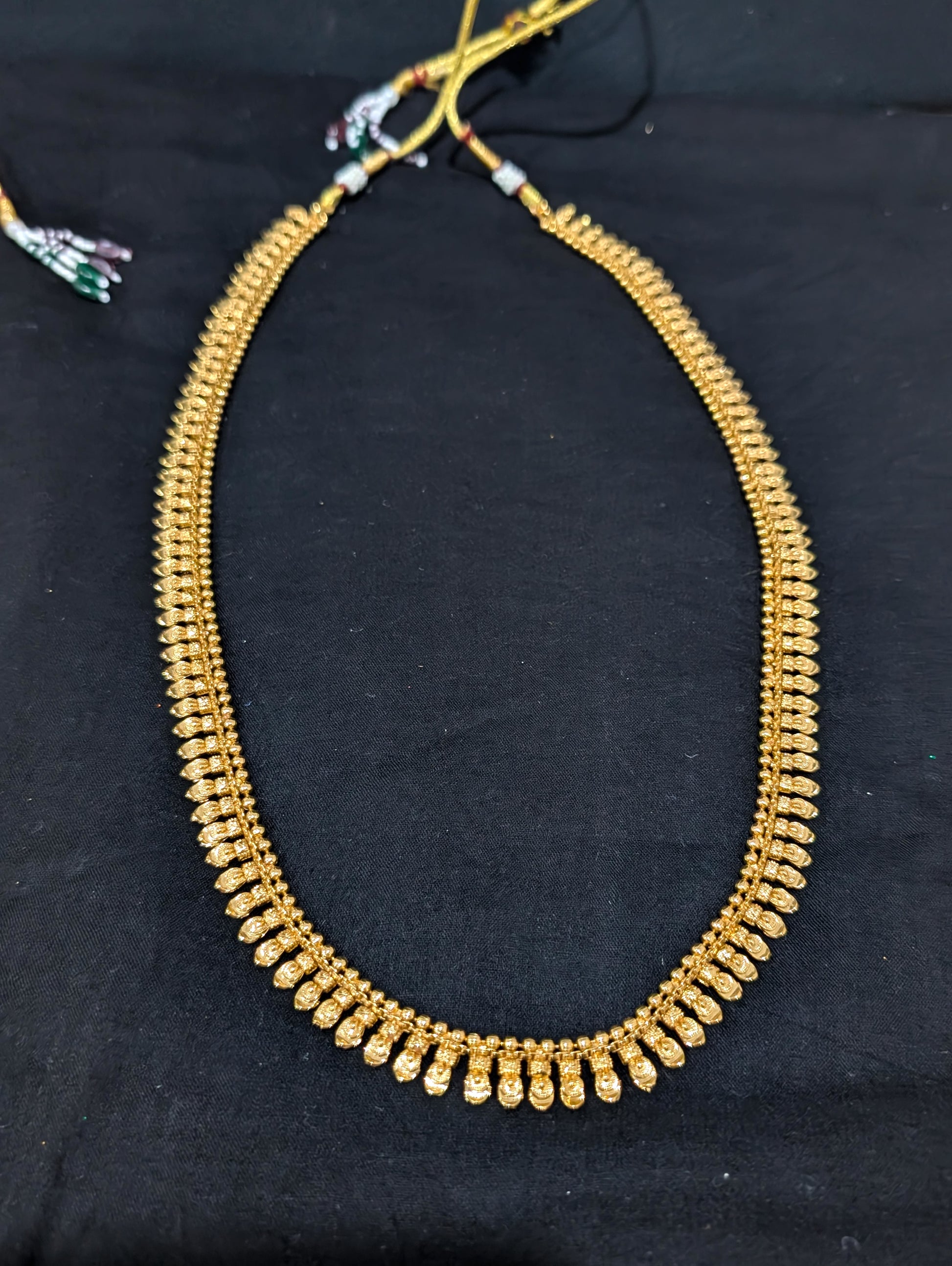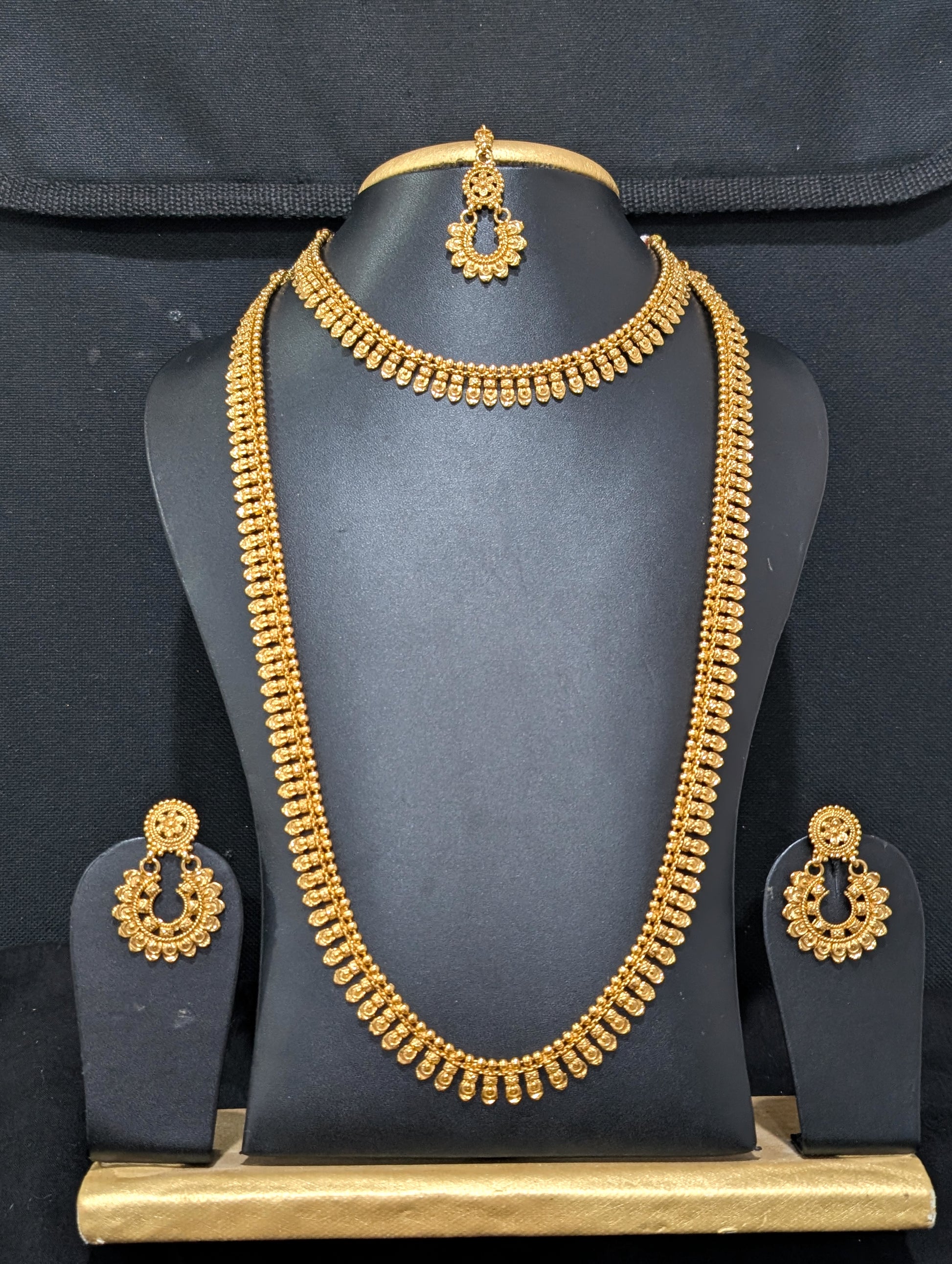Set includes long haram, choker necklace, earrings and maang tikka.