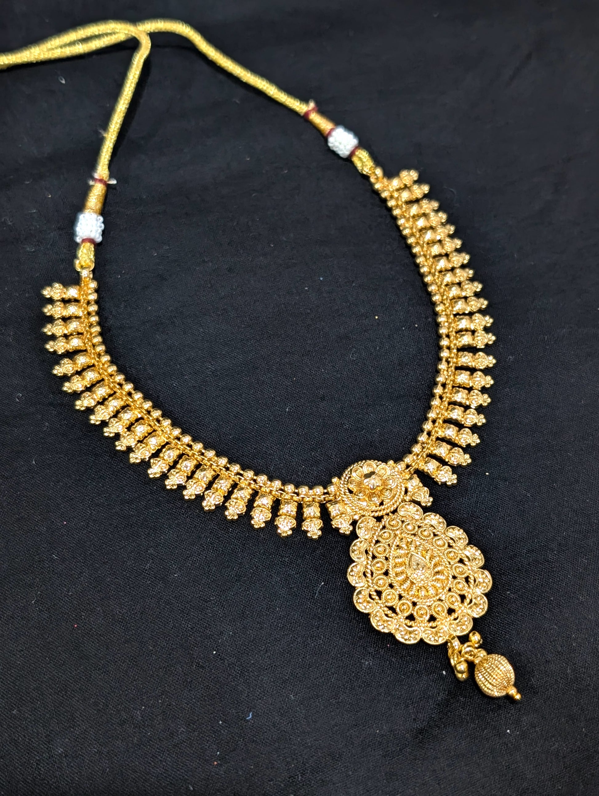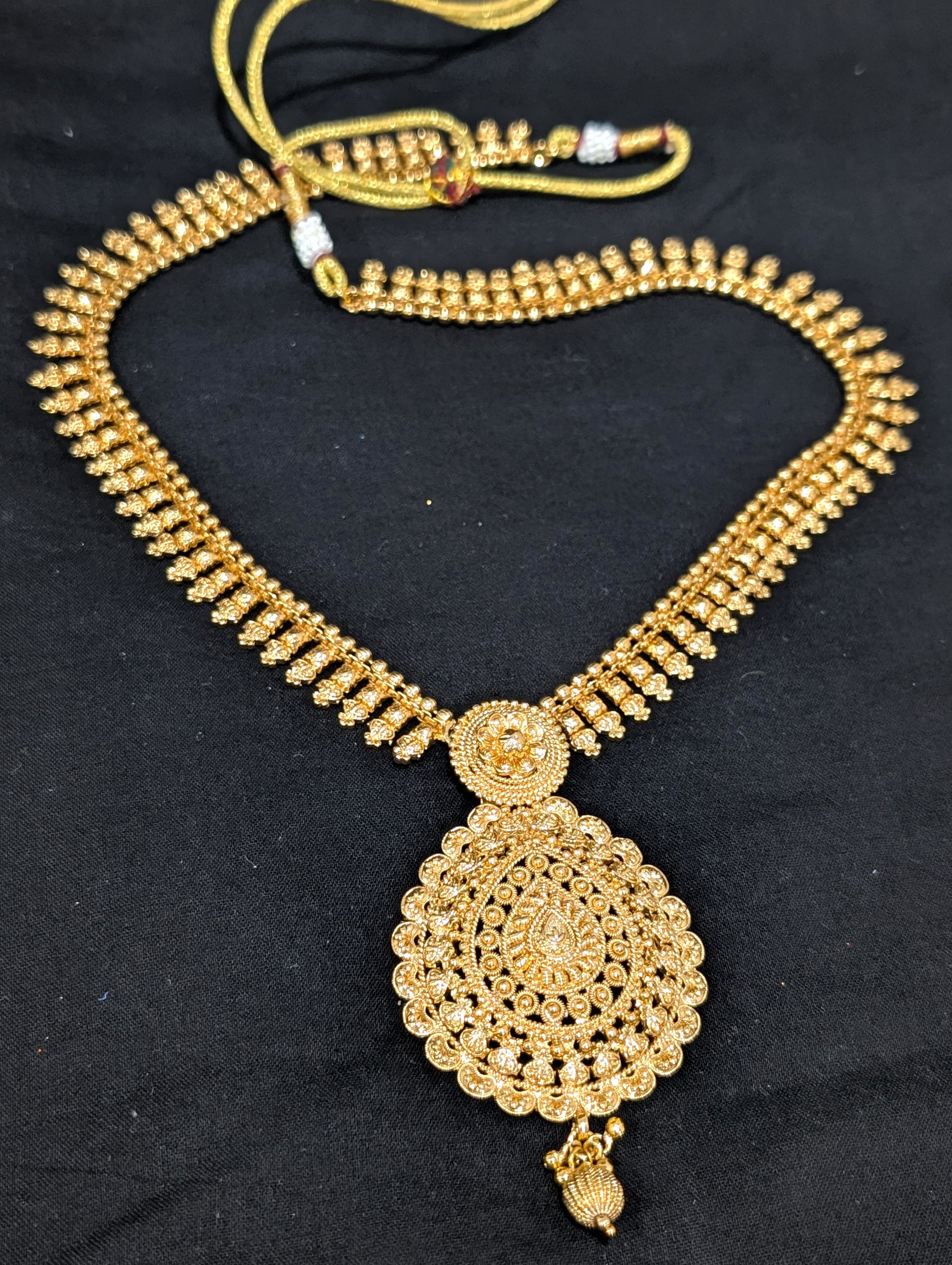 Set includes long haram, choker necklace, earrings and maang tikka.