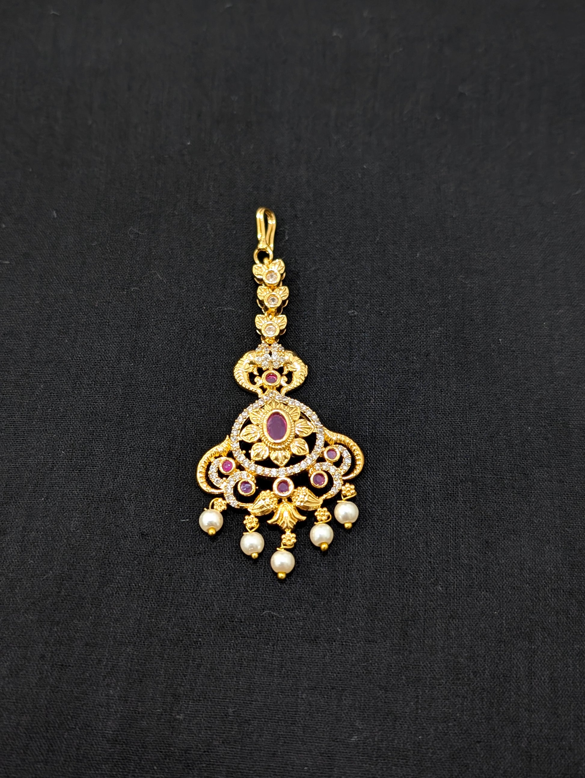 Micro gold polished Ruby Green White CZ stone Maang Tikka.