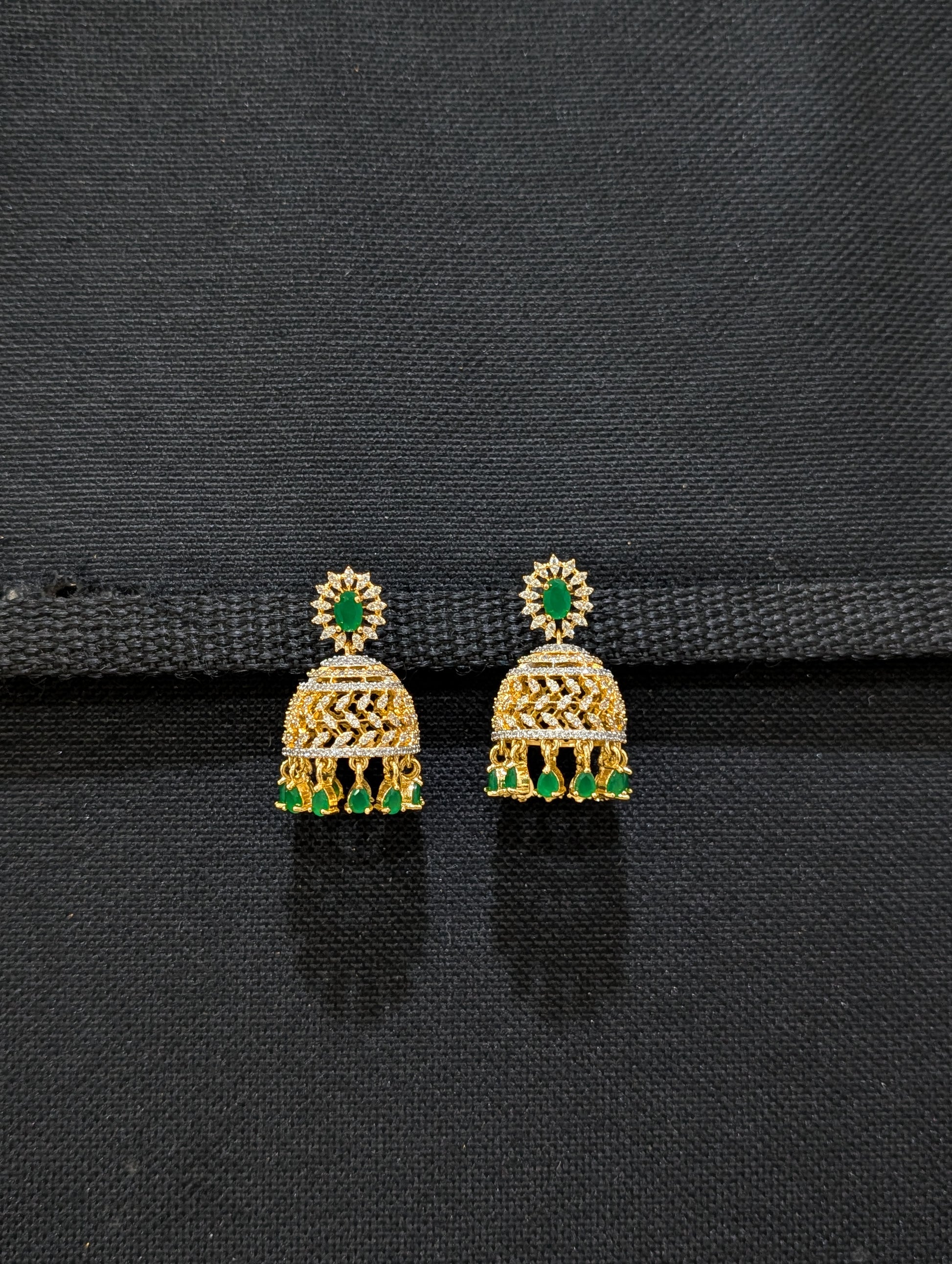 Ruby Green White CZ stone embedded oval stud dangle jhumka.