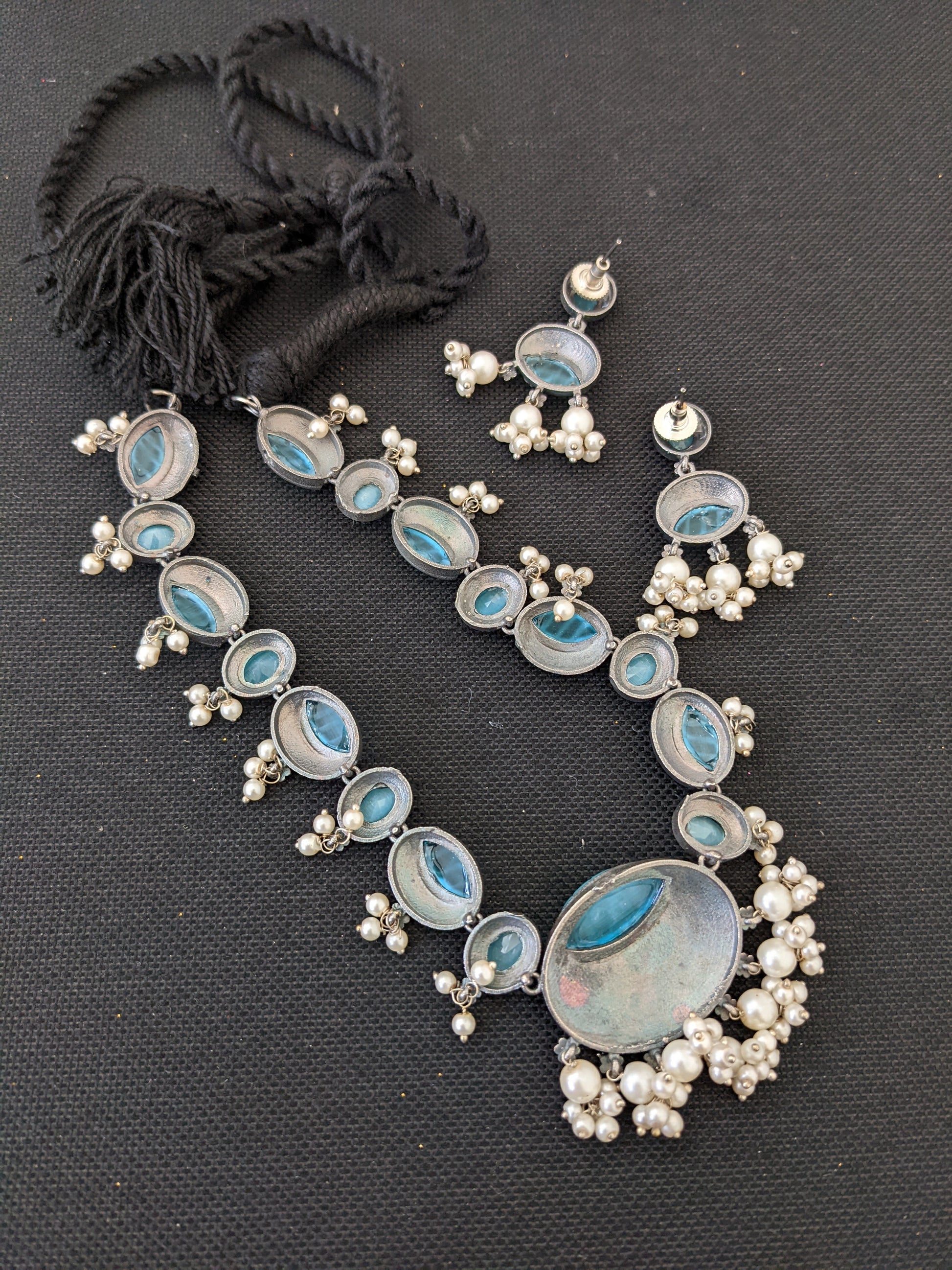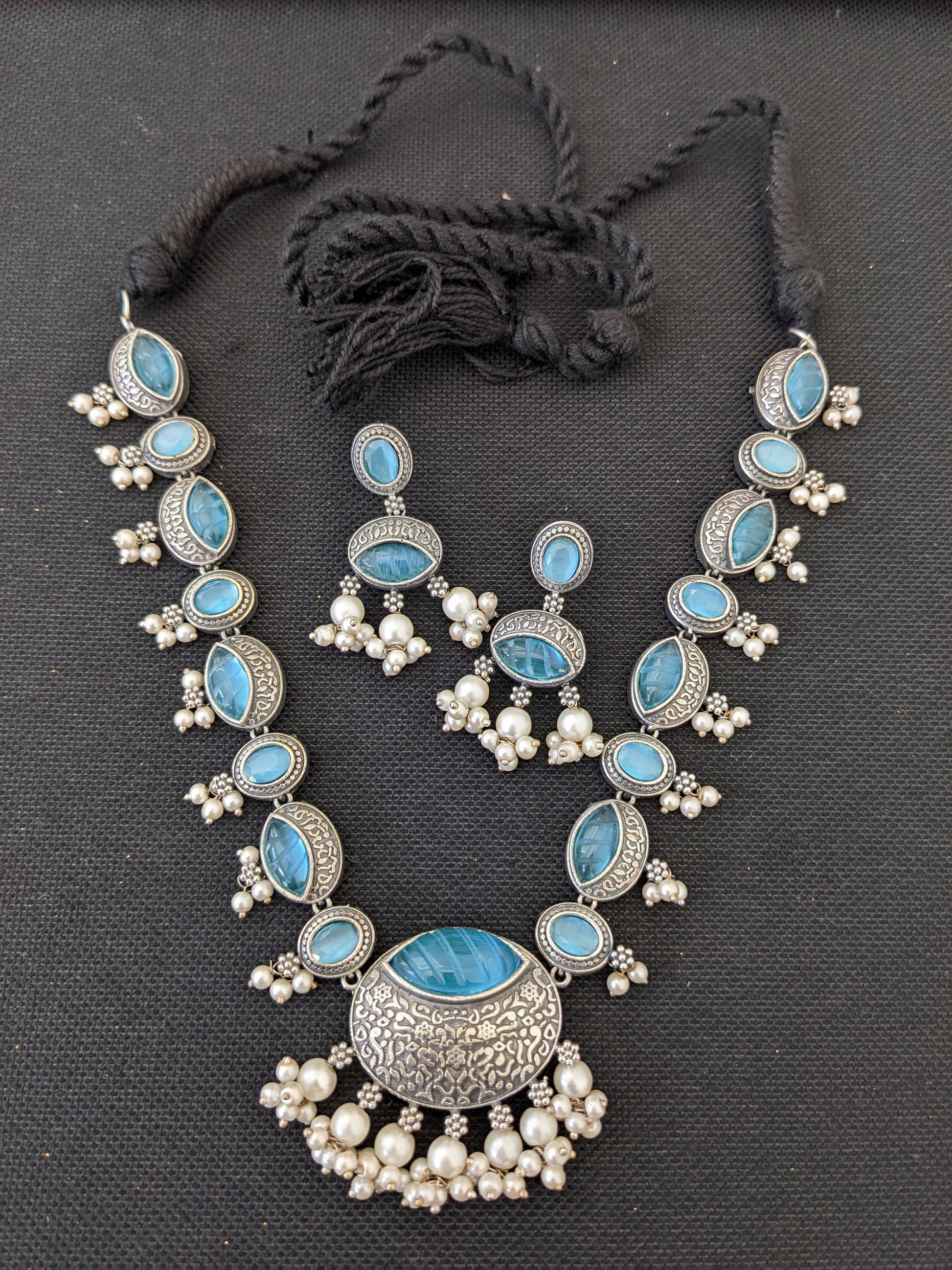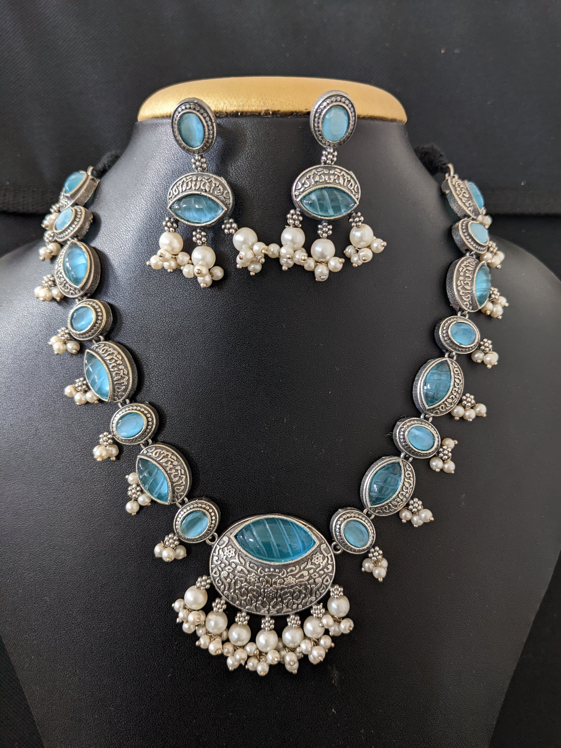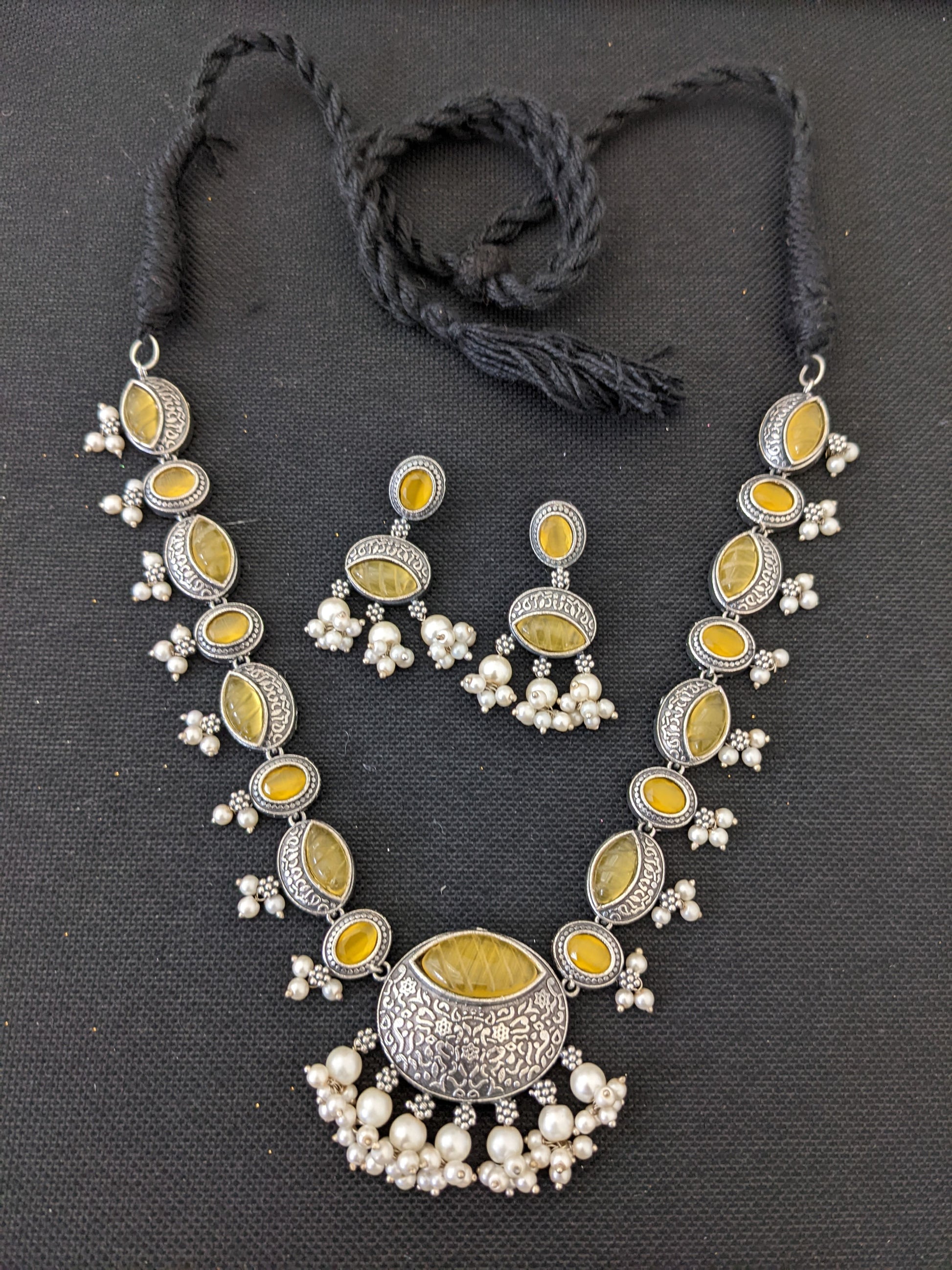 Oxidized Silver Adigai style Carved Resin stone Choker set