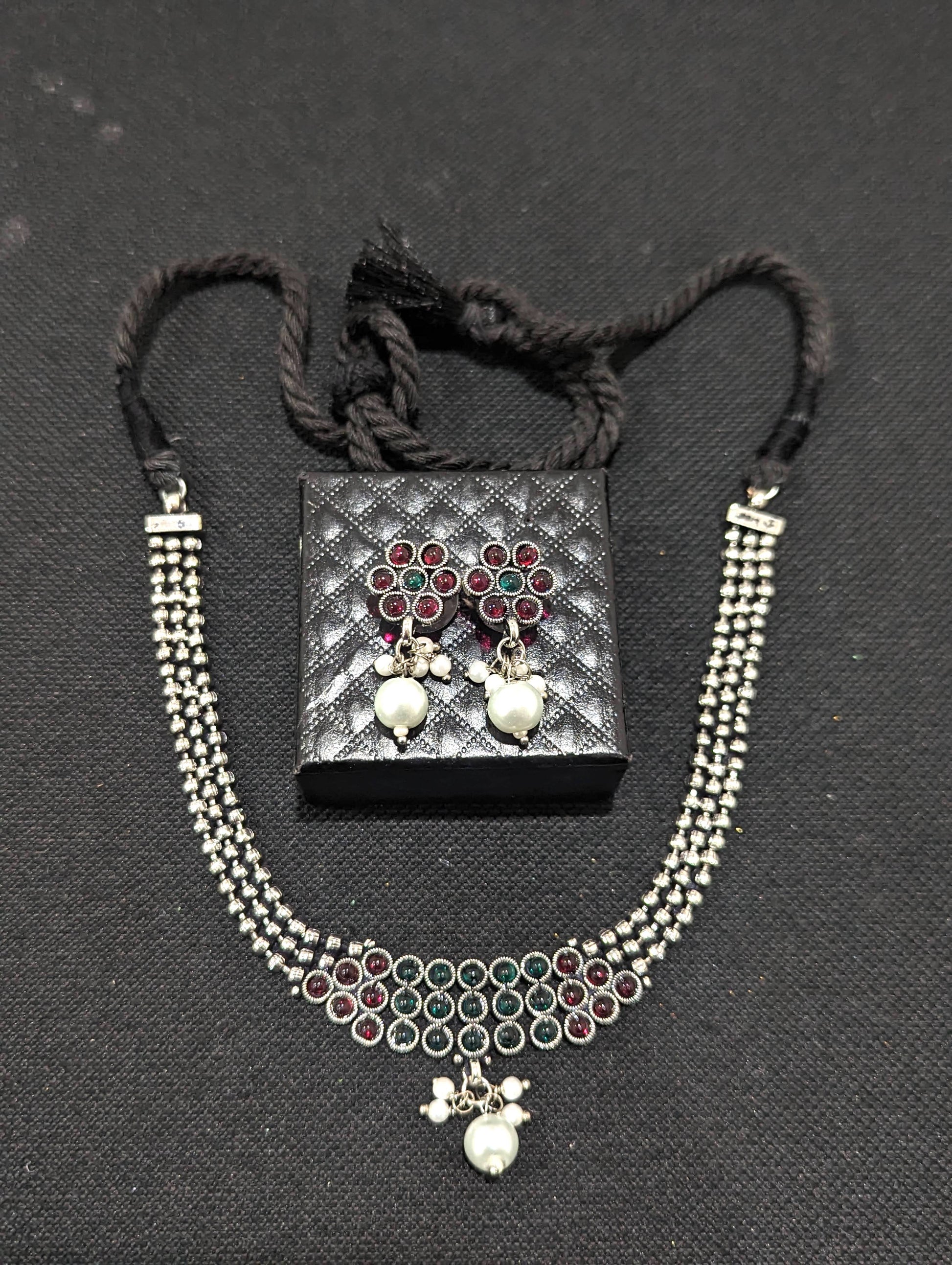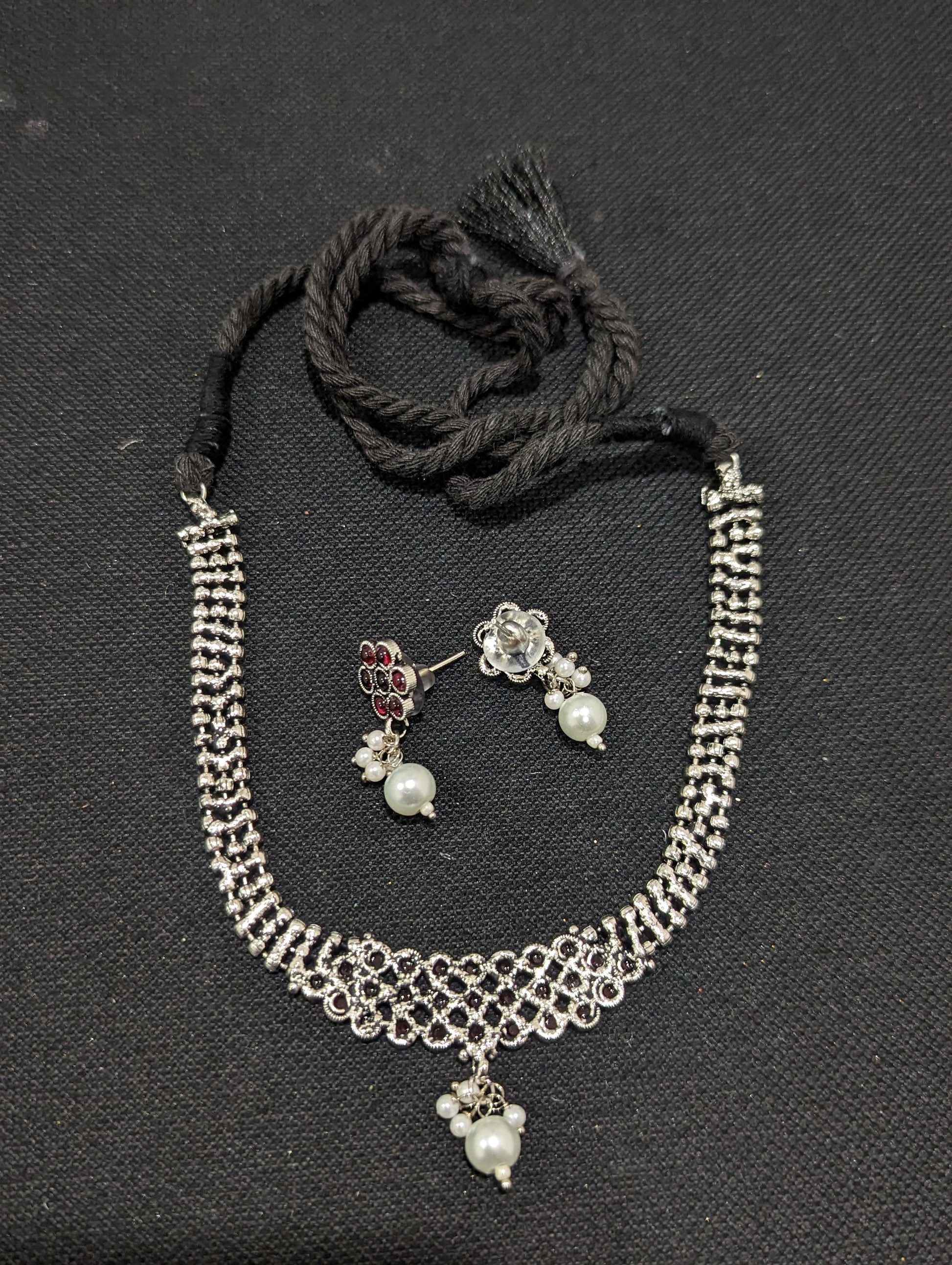 Oxidized silver Dori thread Choker Necklace set - Design 1