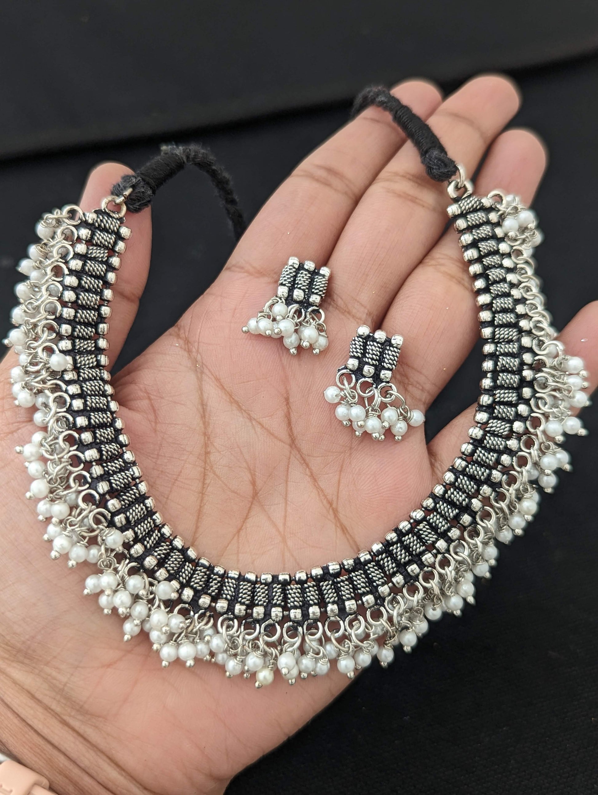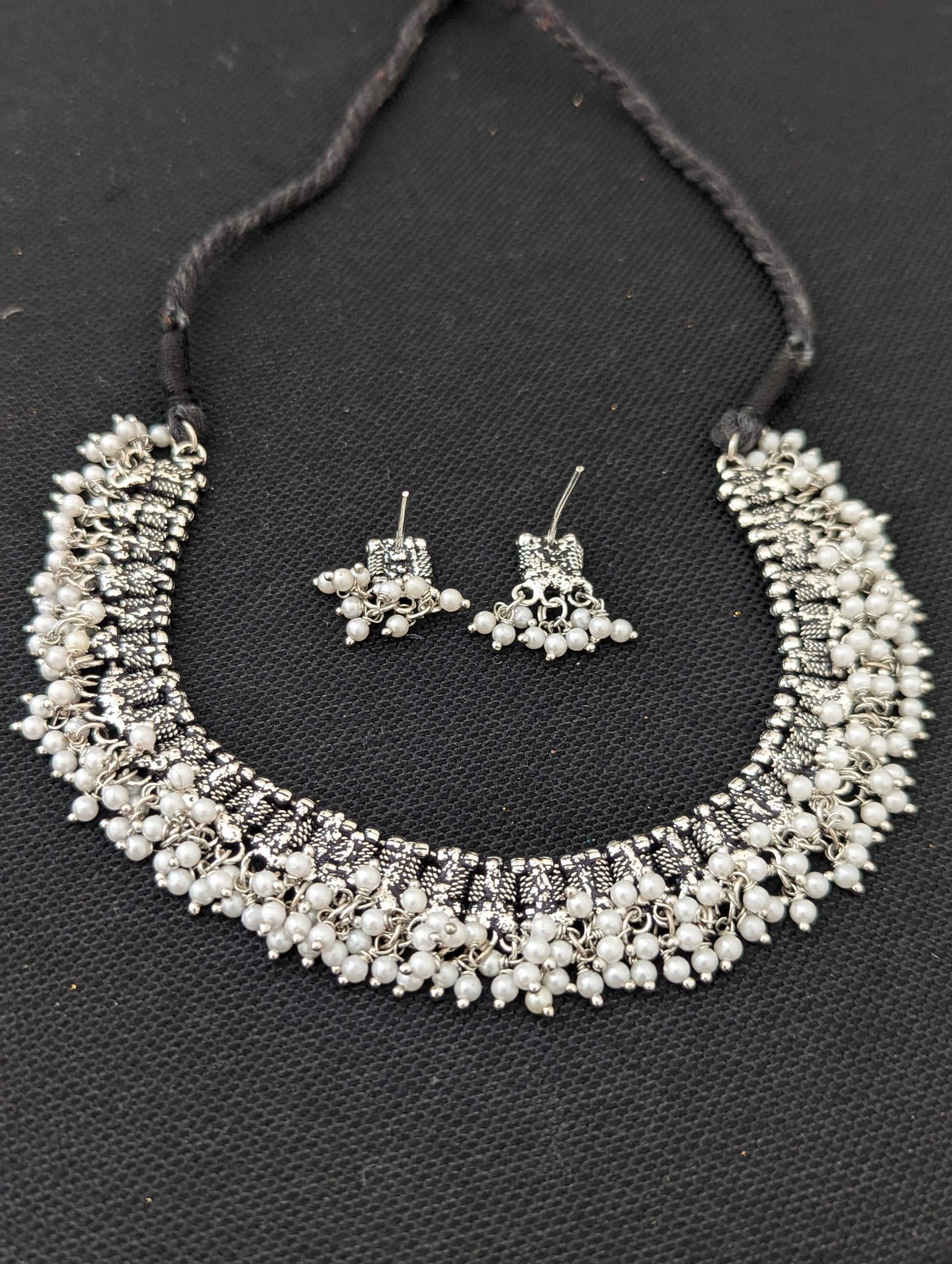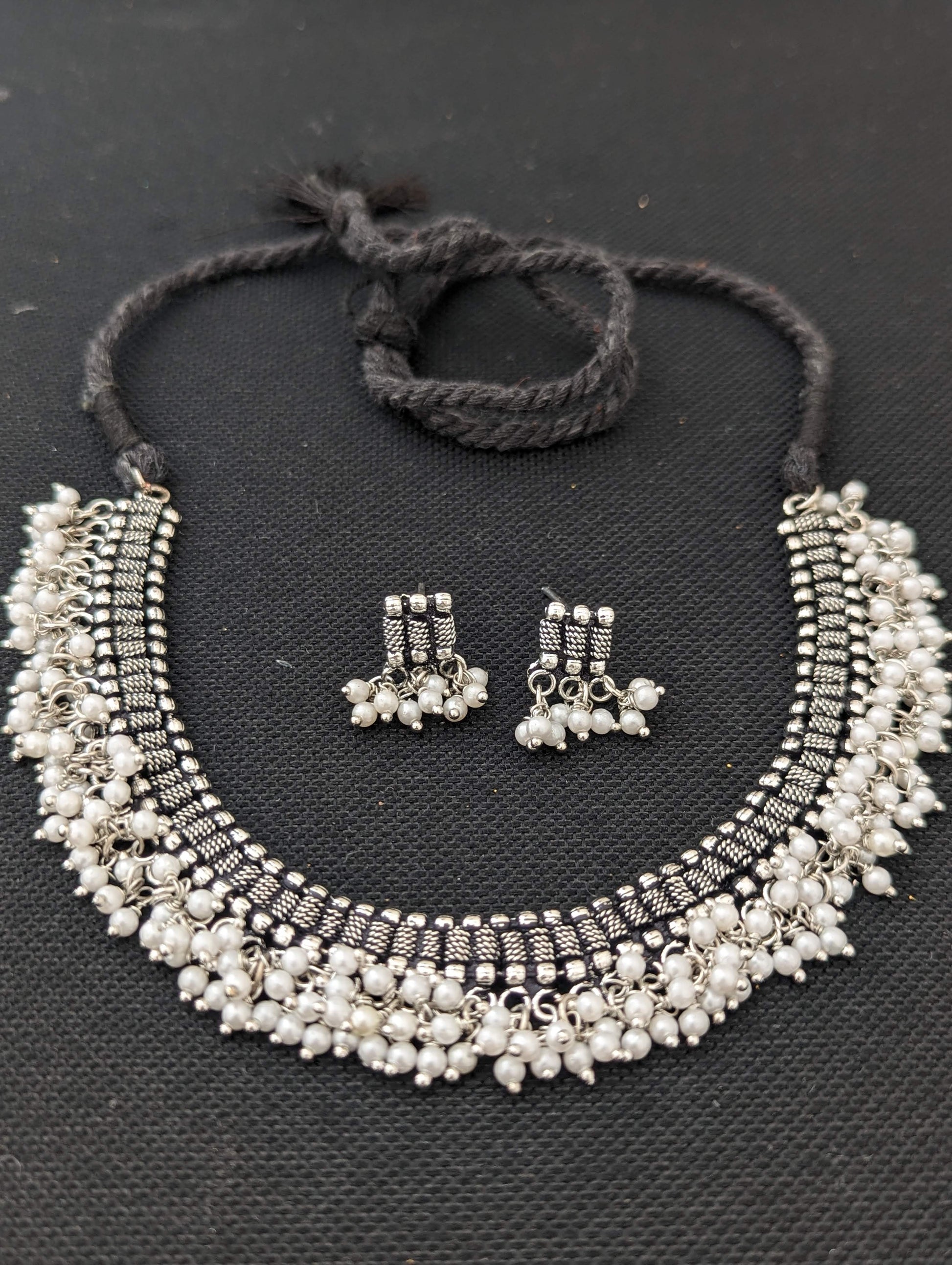 Oxidized silver Dori thread Choker Necklace set - Design 5