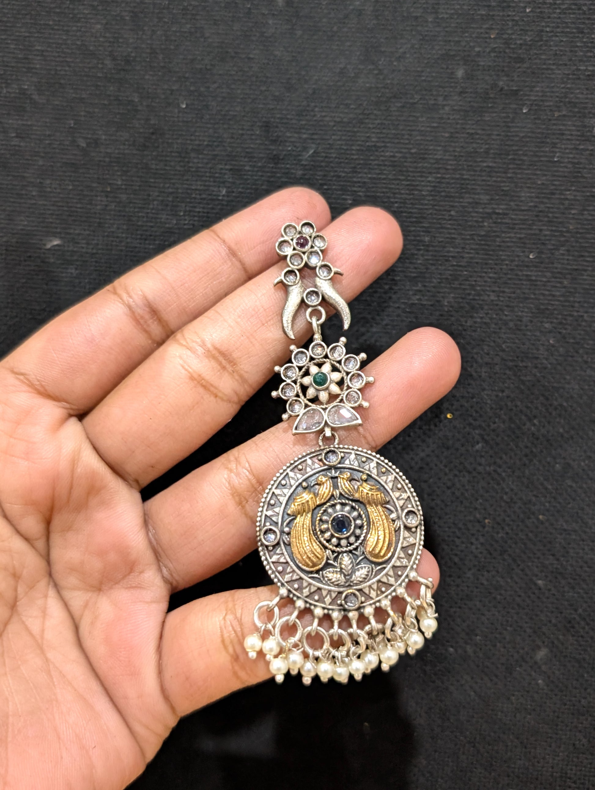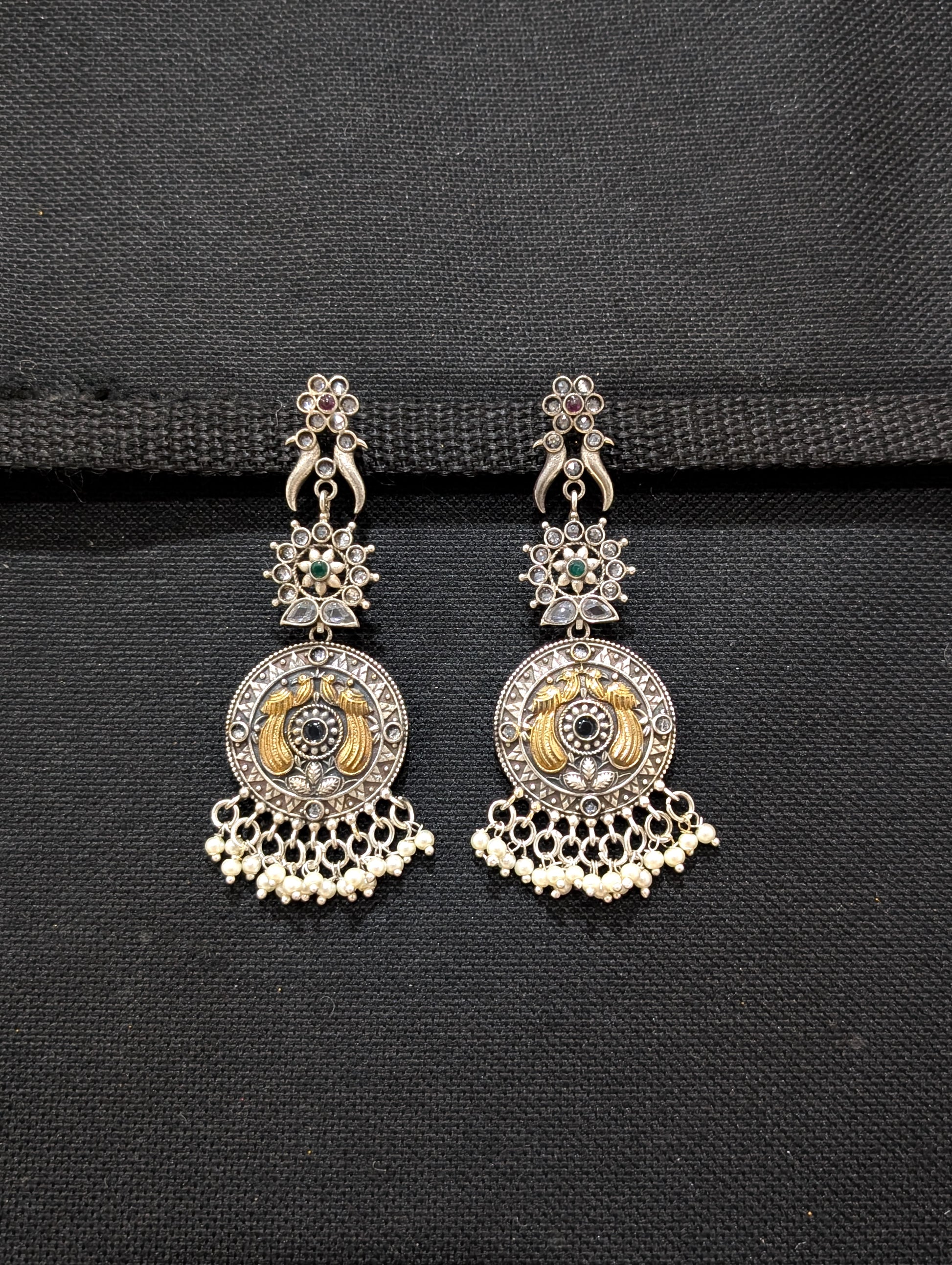 Real silver look alike dual tone oxidized silver CZ stone pasted Dangle earrings.