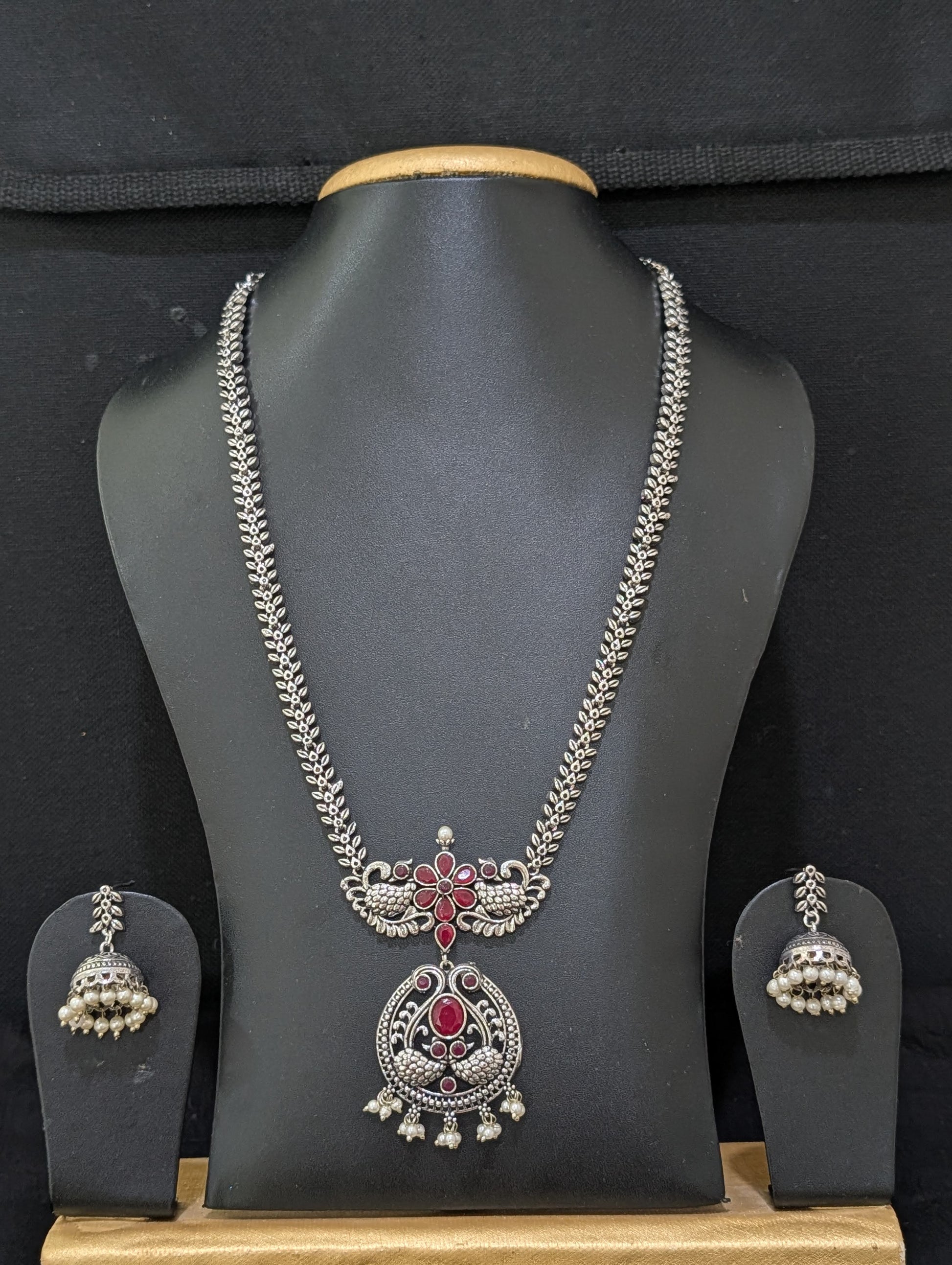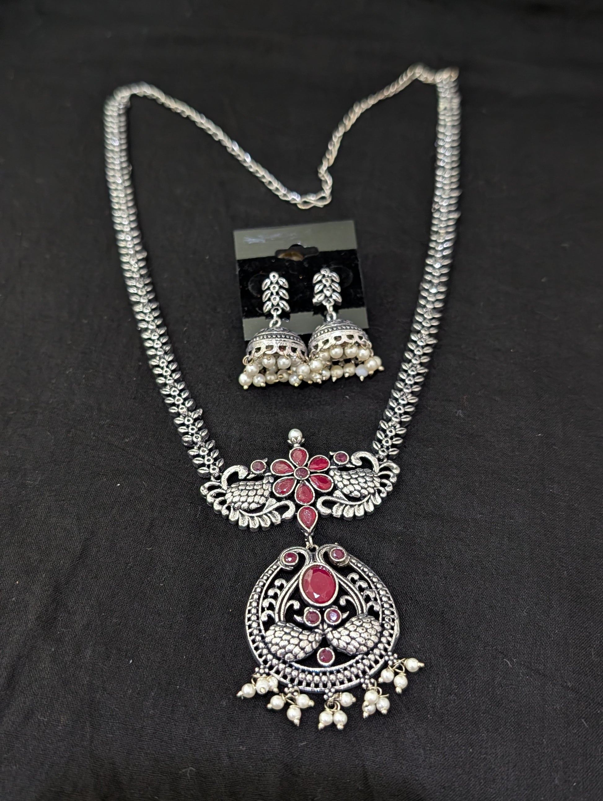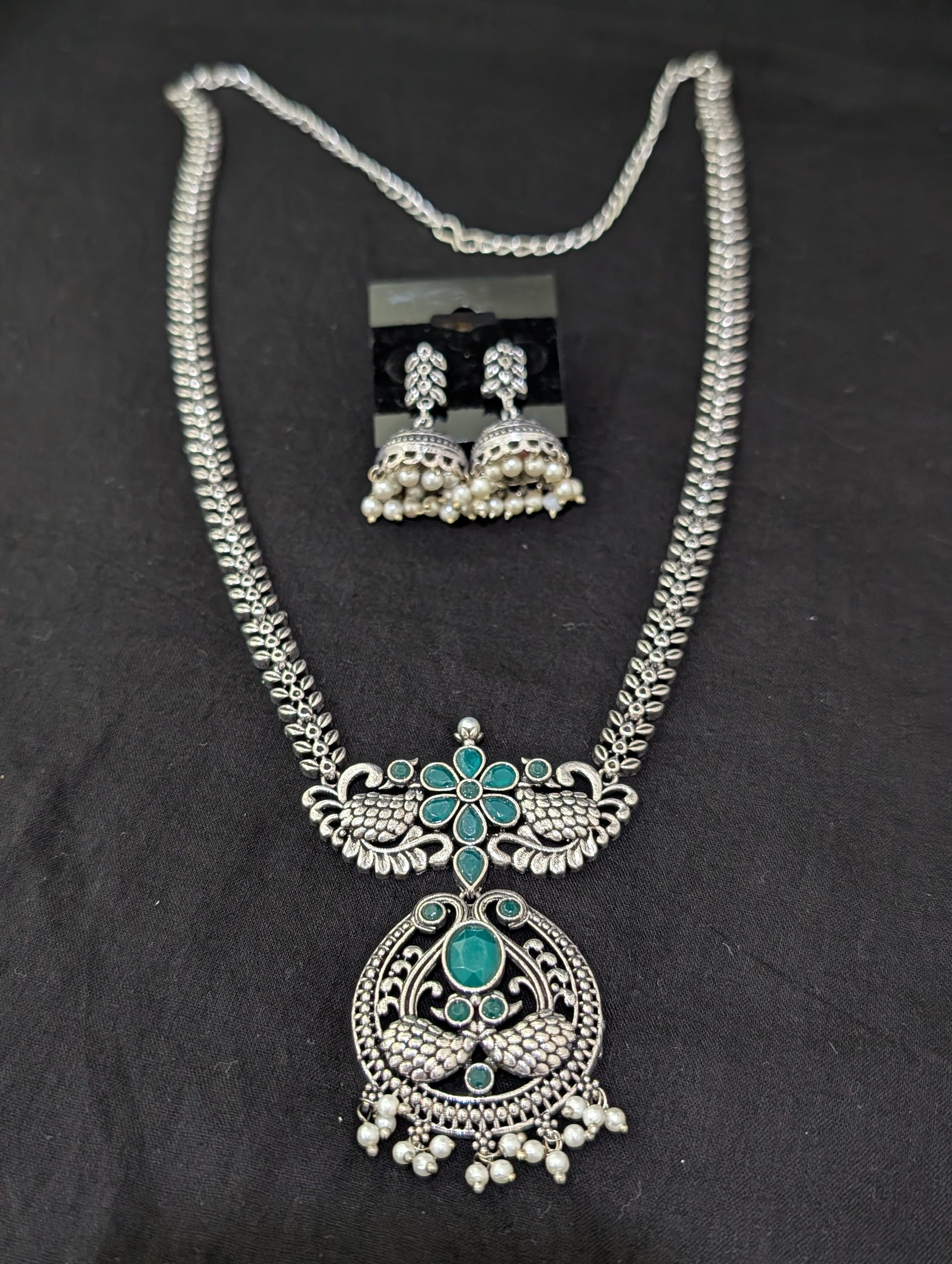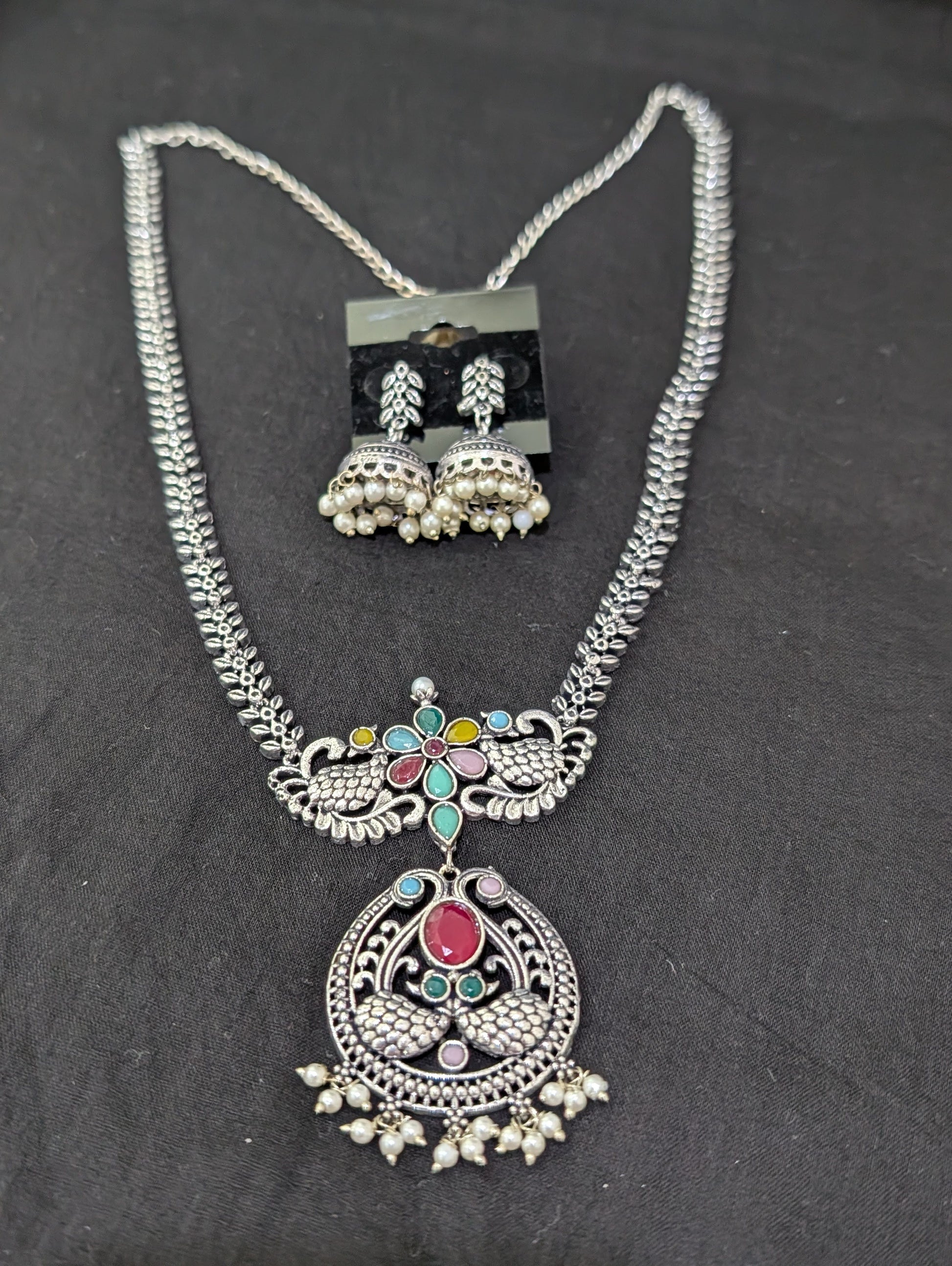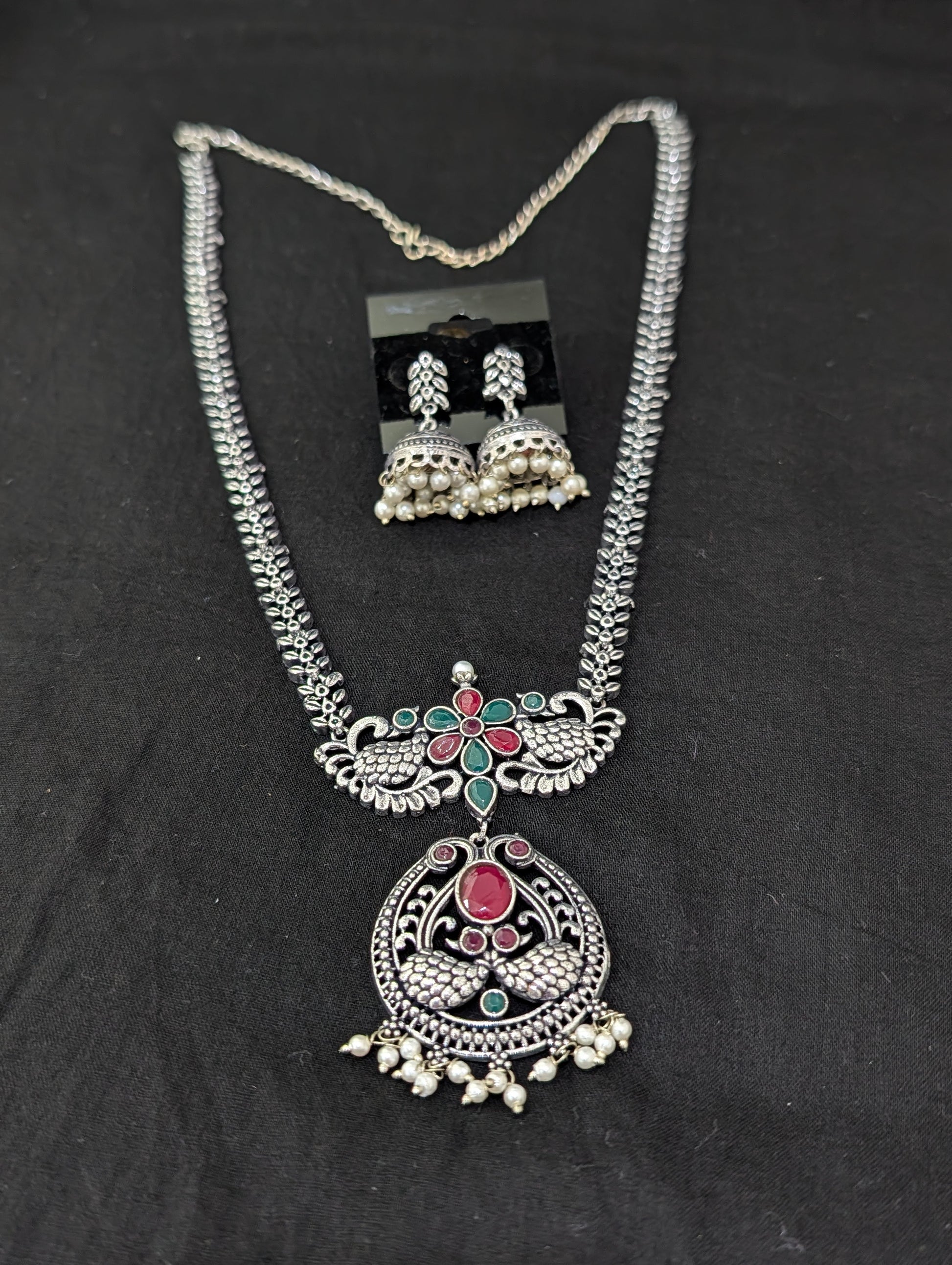 Oxidized Silver Peacock design necklace and earrings set