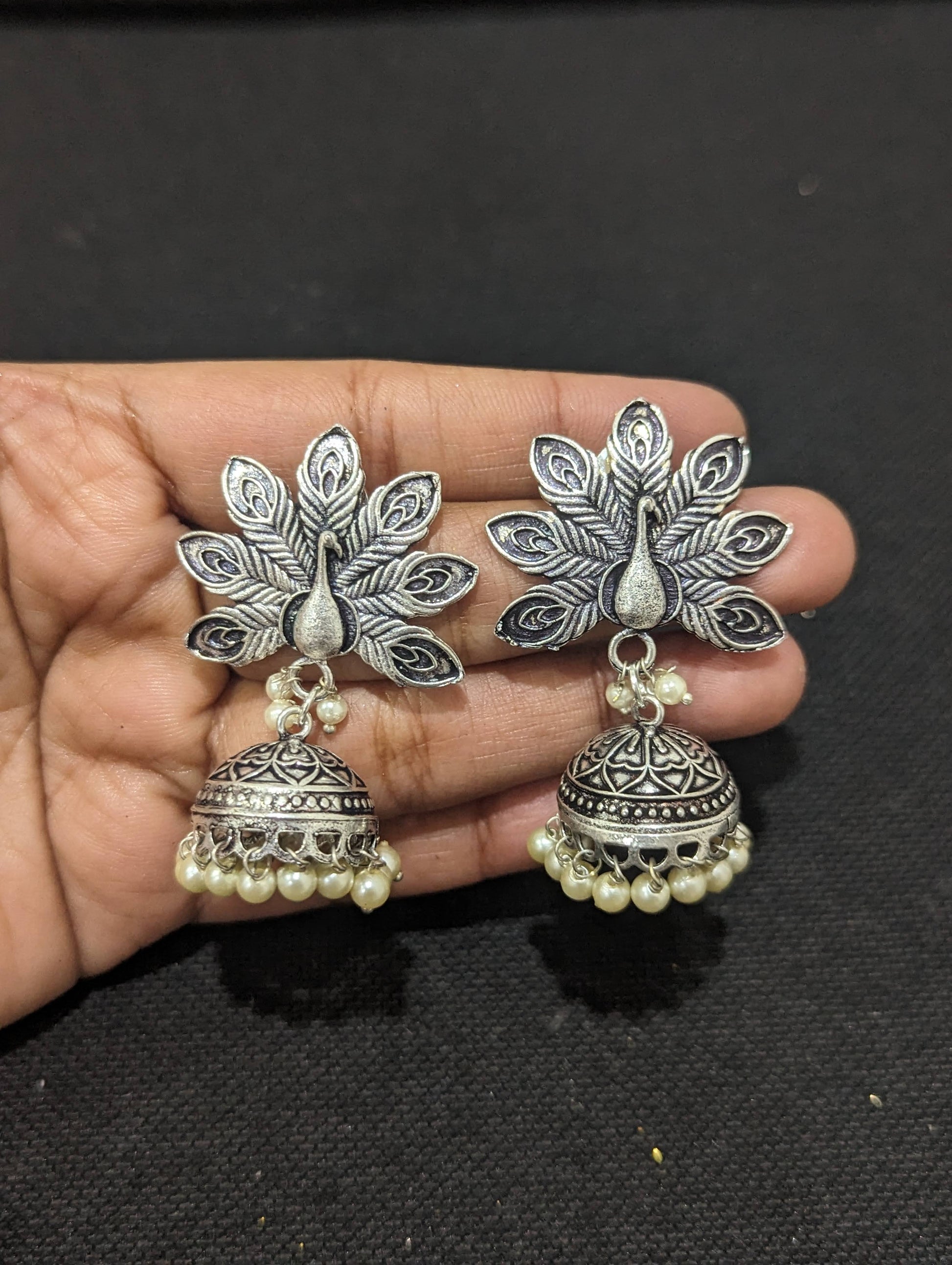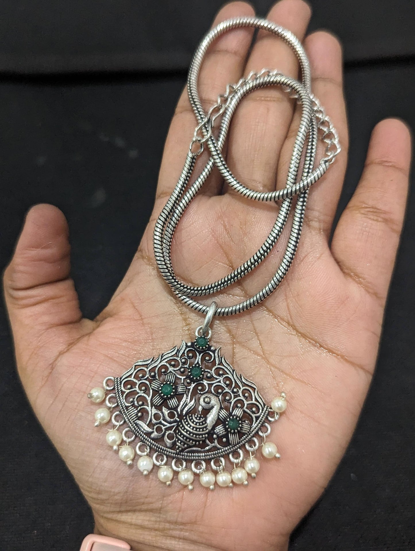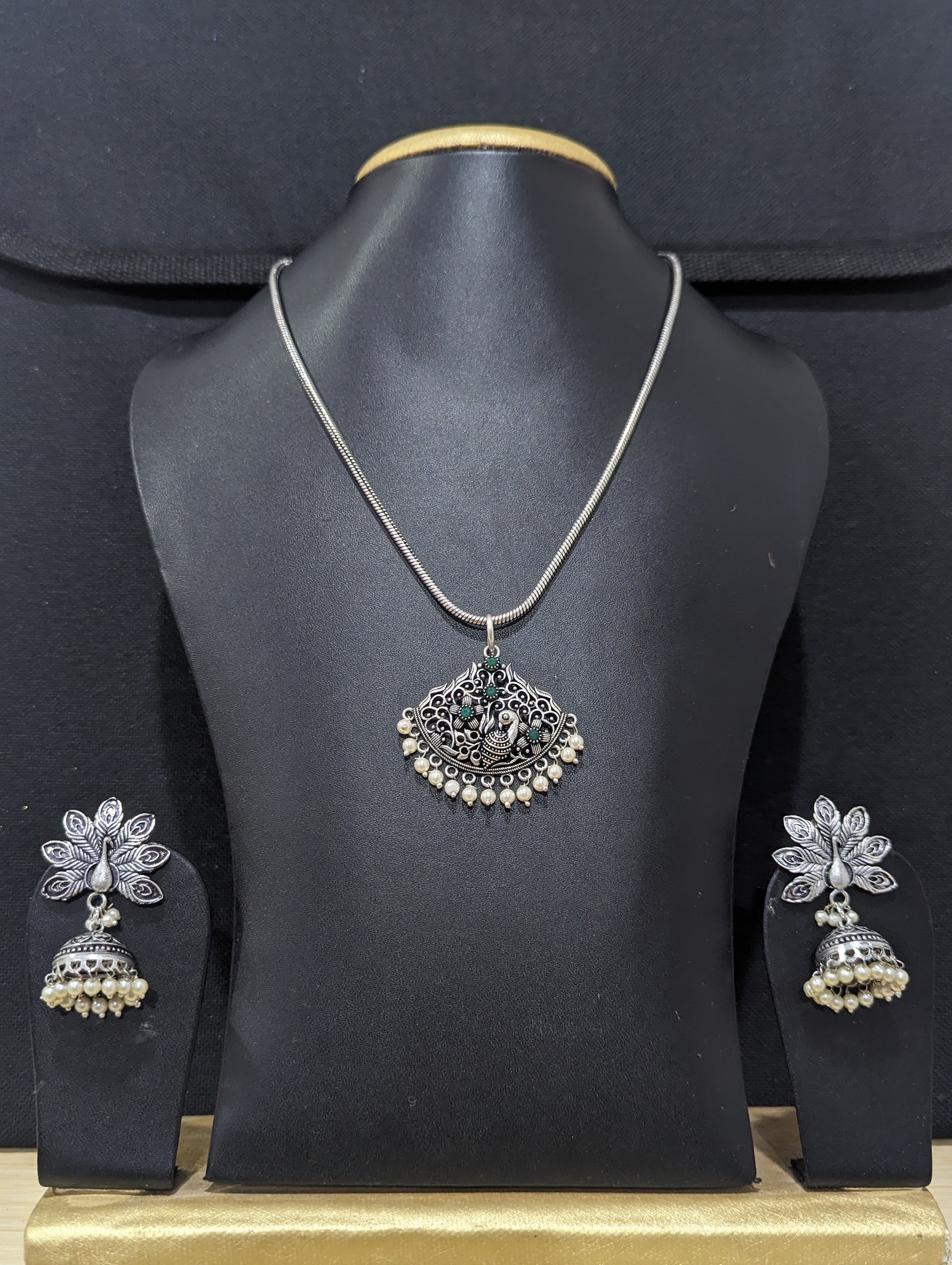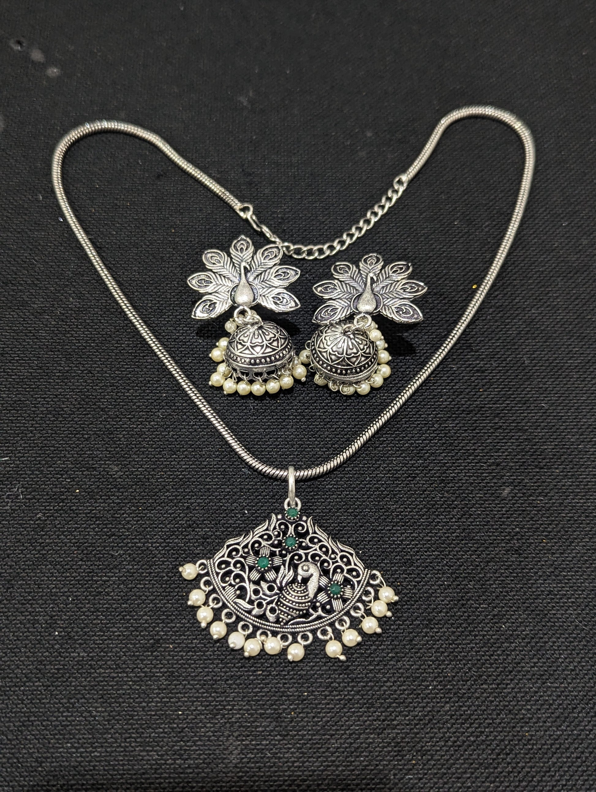 Oxidized silver Peacock pendant design necklace and Jhumka earrings set.
