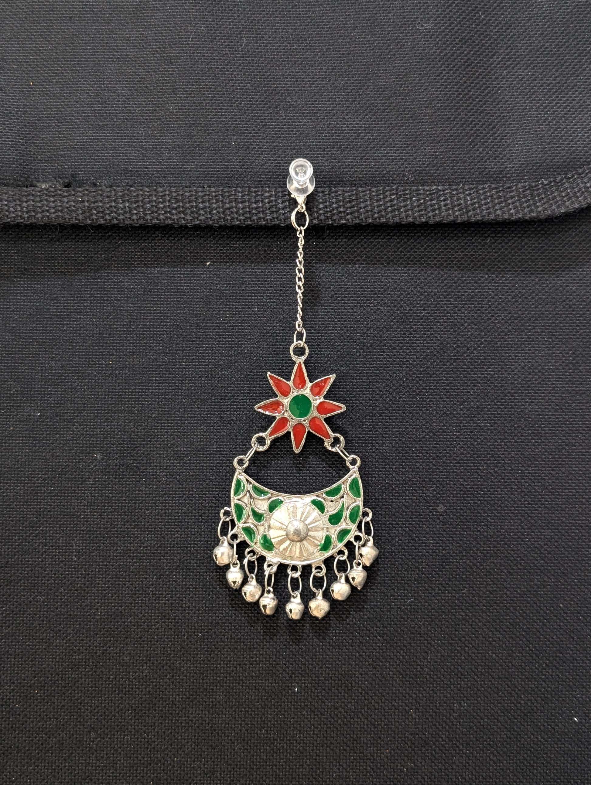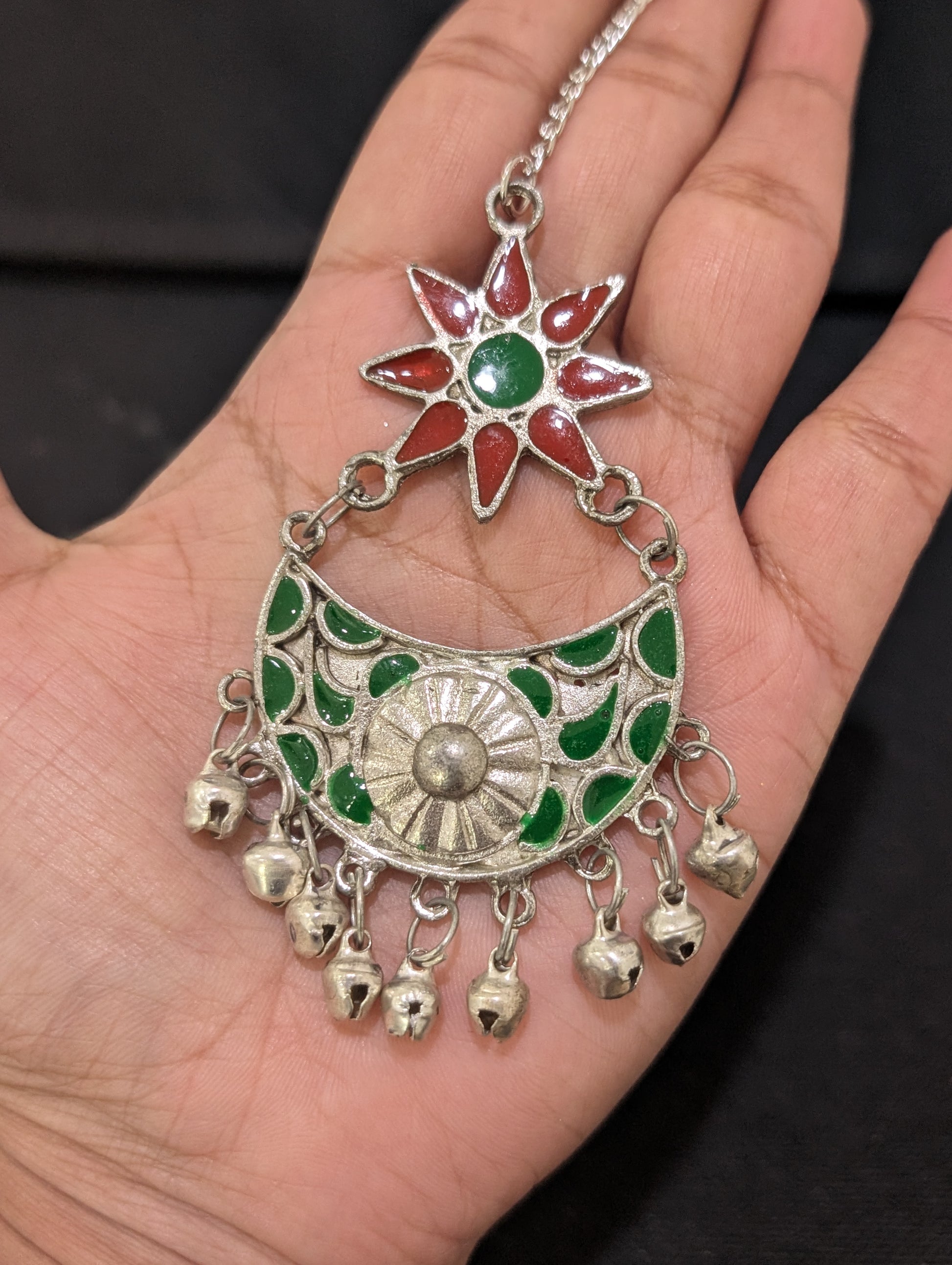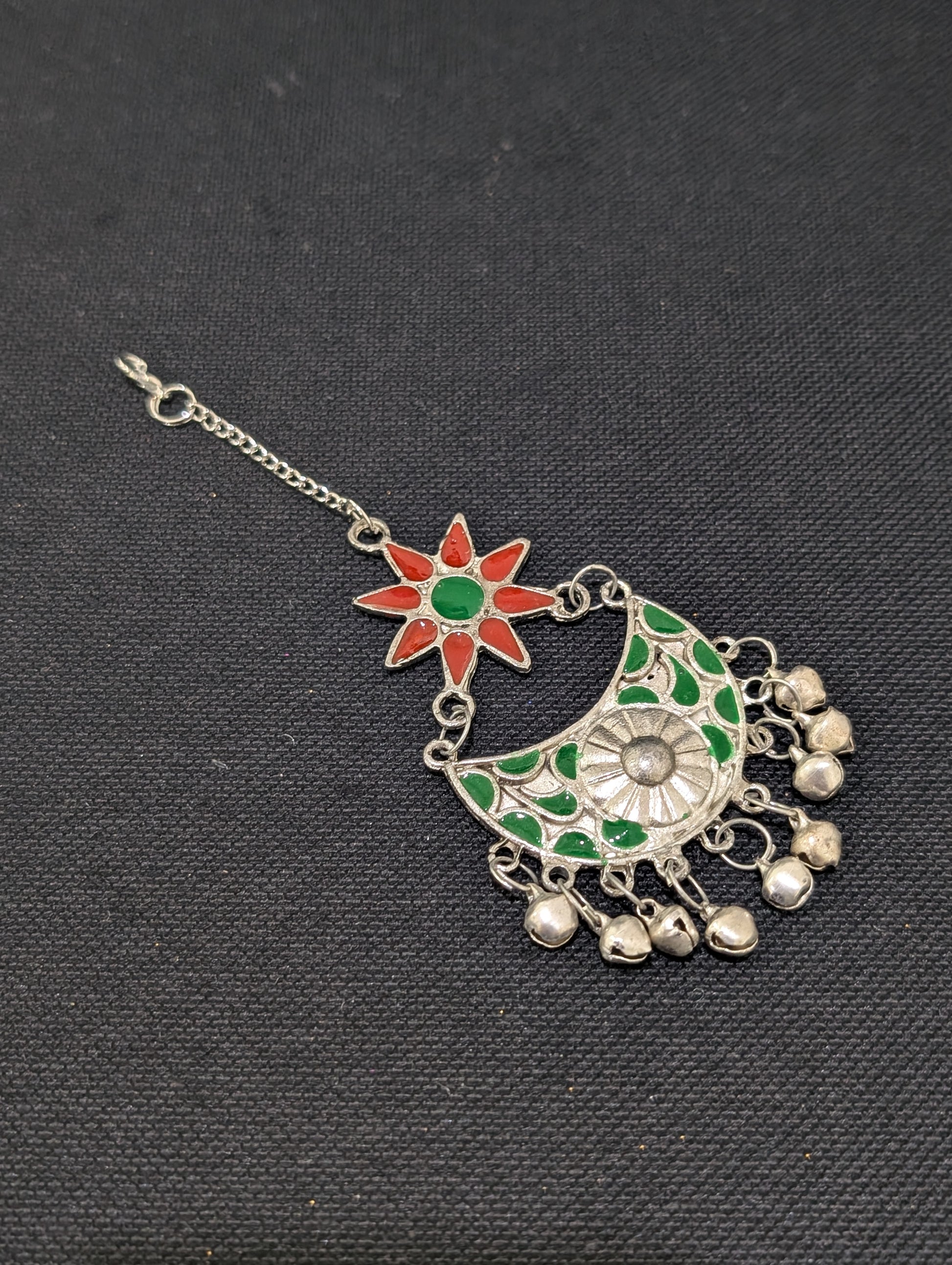 Oxidized Silver Red Green Enamel Large Maang Tikka