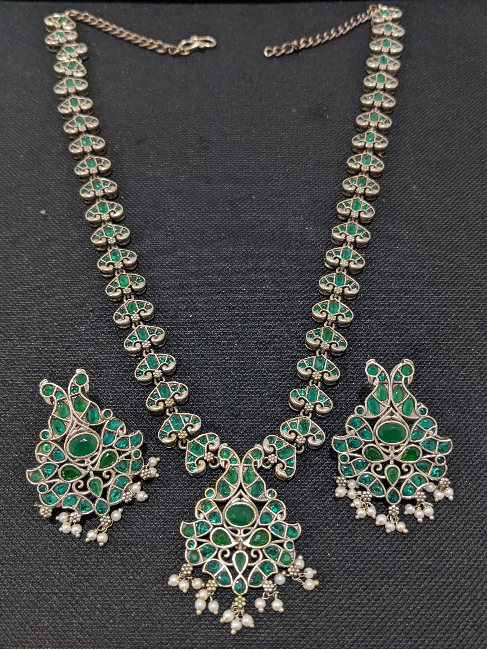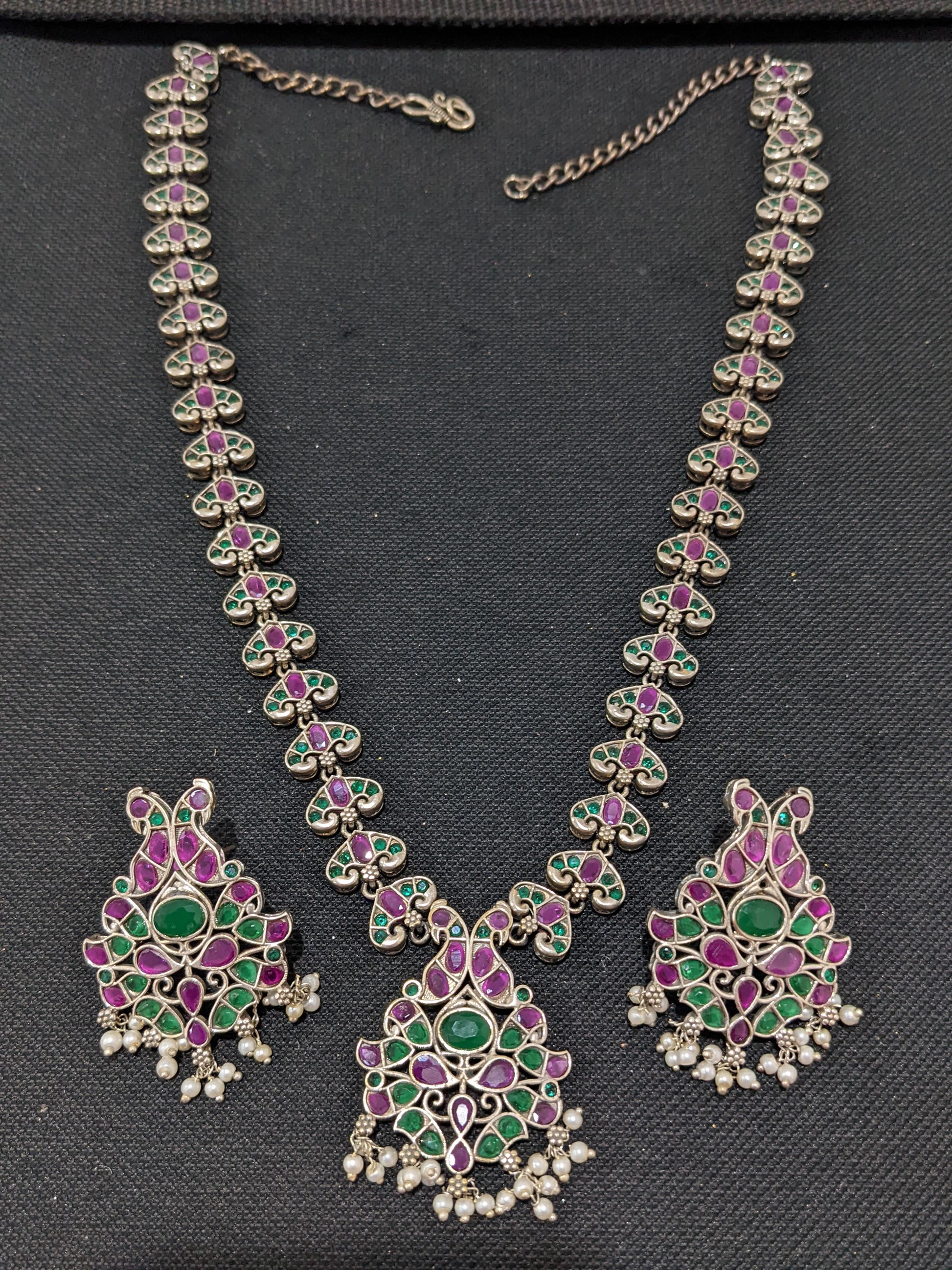 Peacock design CZ stone German Silver Long haram and earrings set