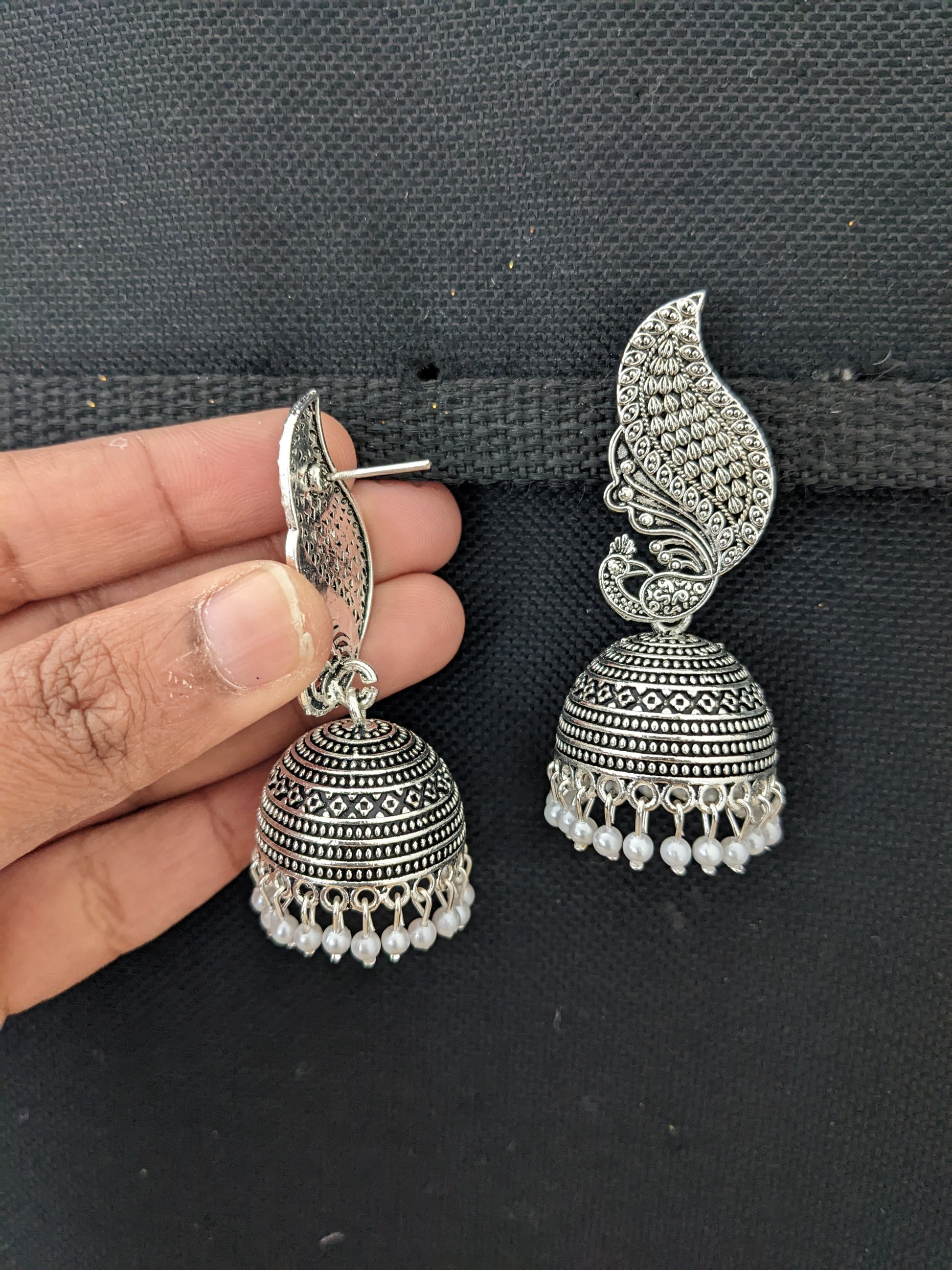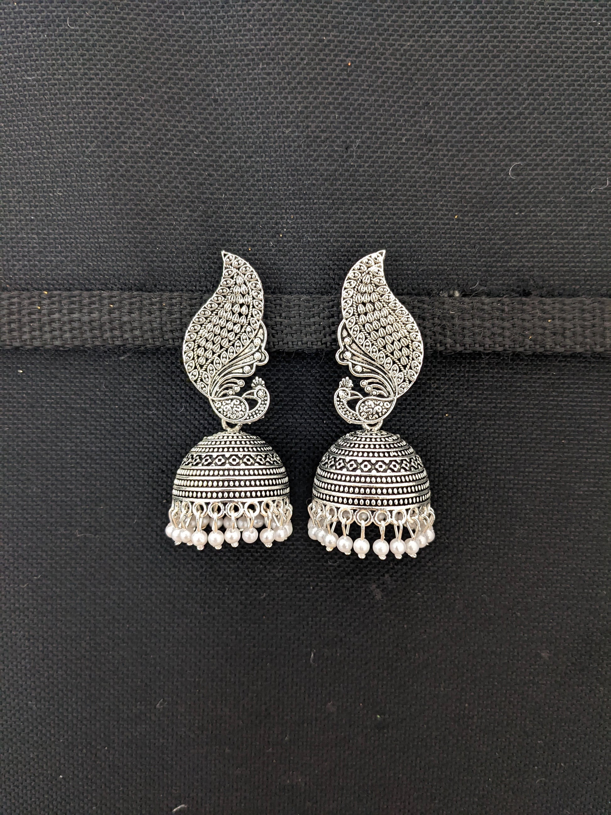 Peacock Oxidized Silver Pearl Jhumka earrings