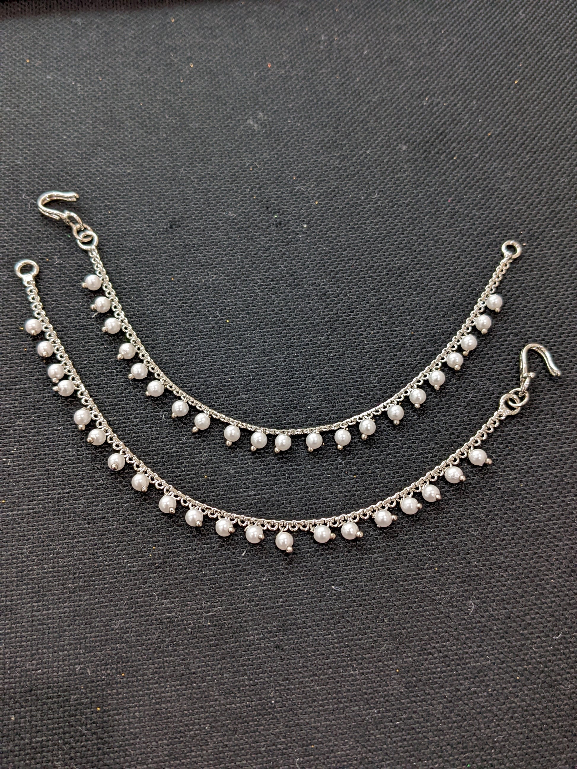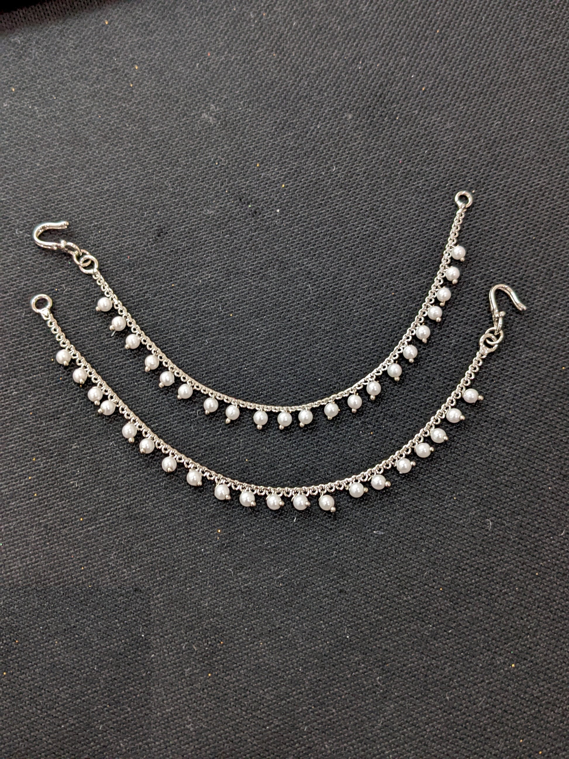 Pearl bead hanging silver rhodium plated single layer ear chain.