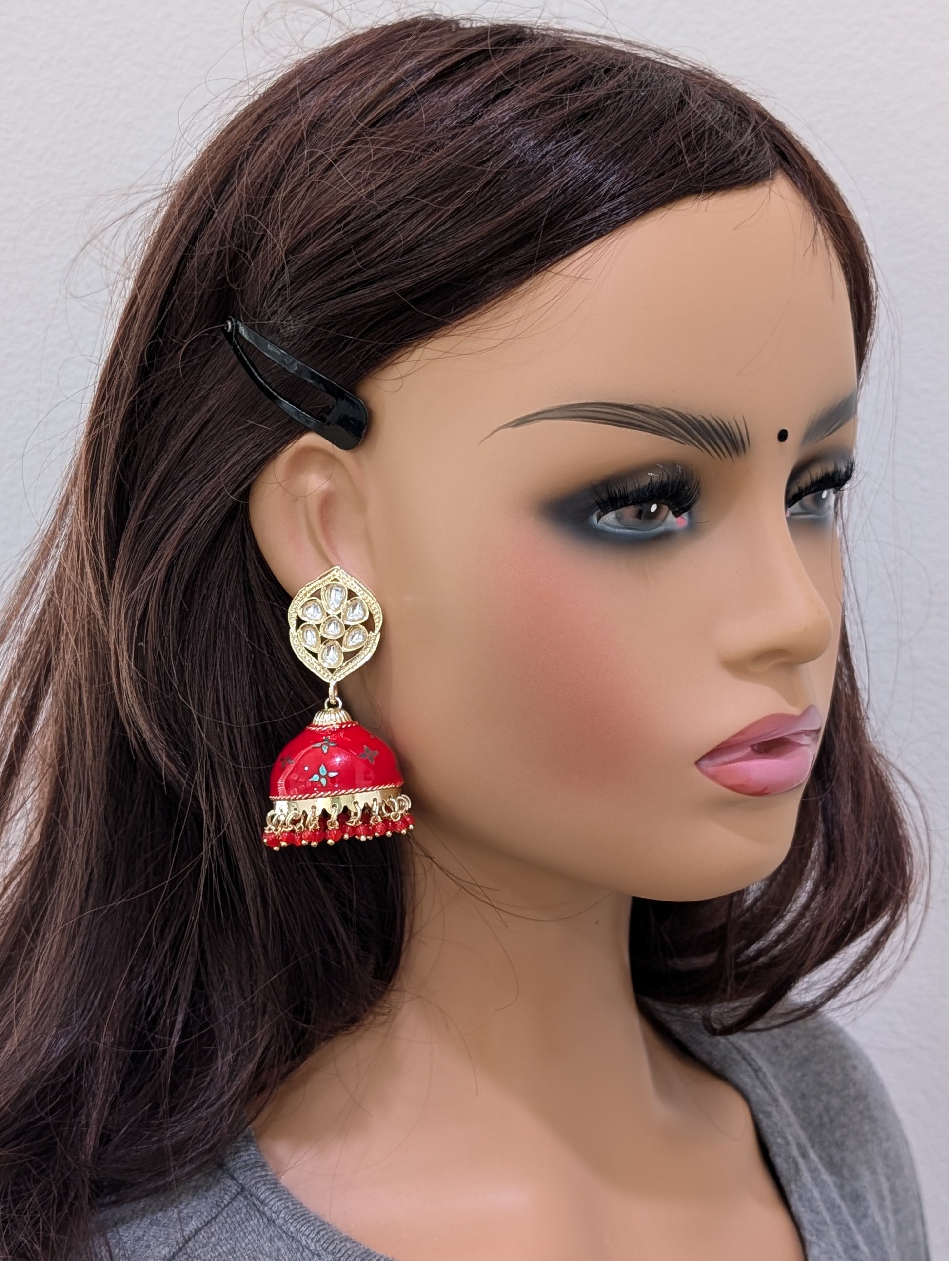 Red Enamel Kundan Jhumka Earrings