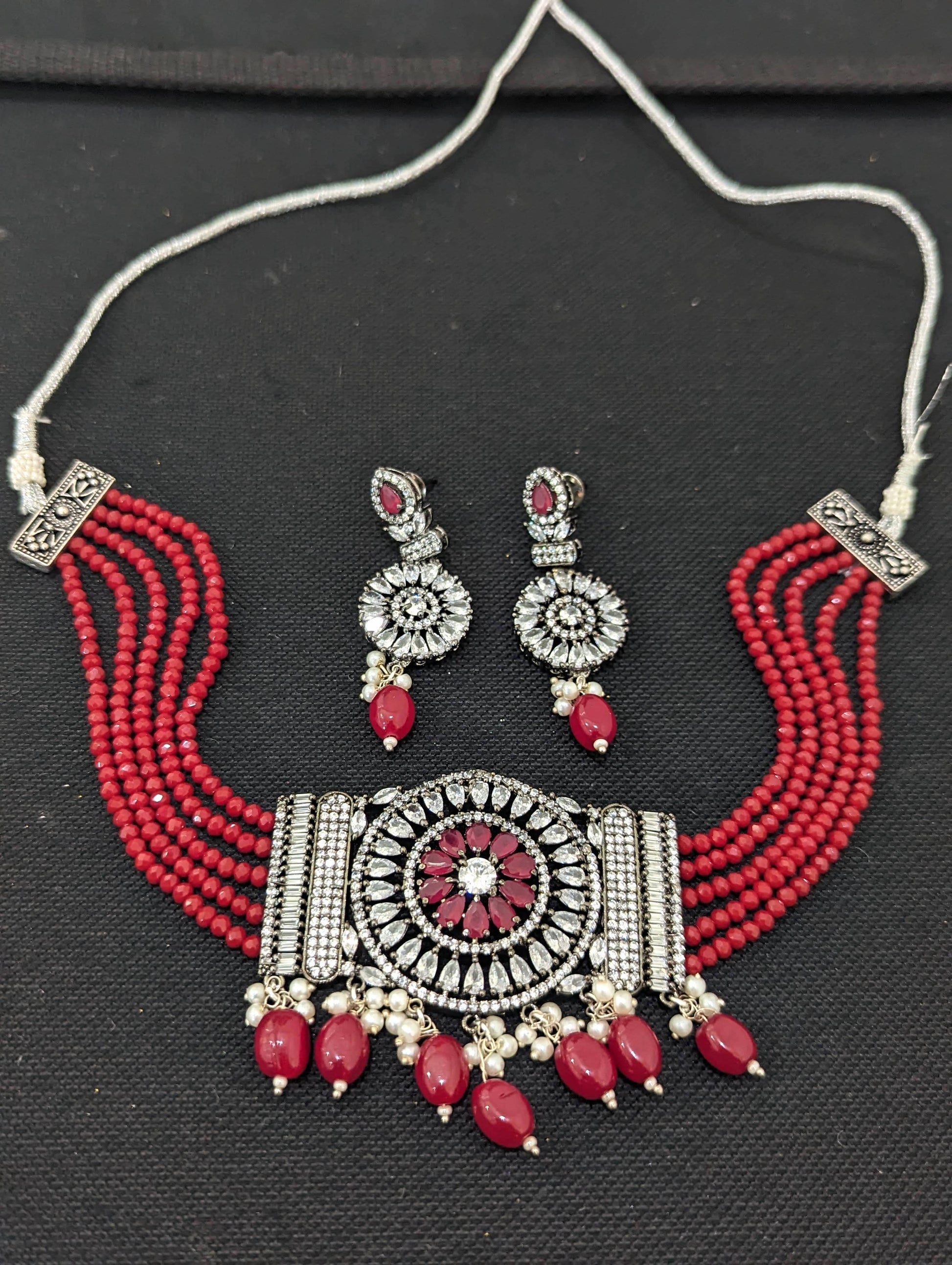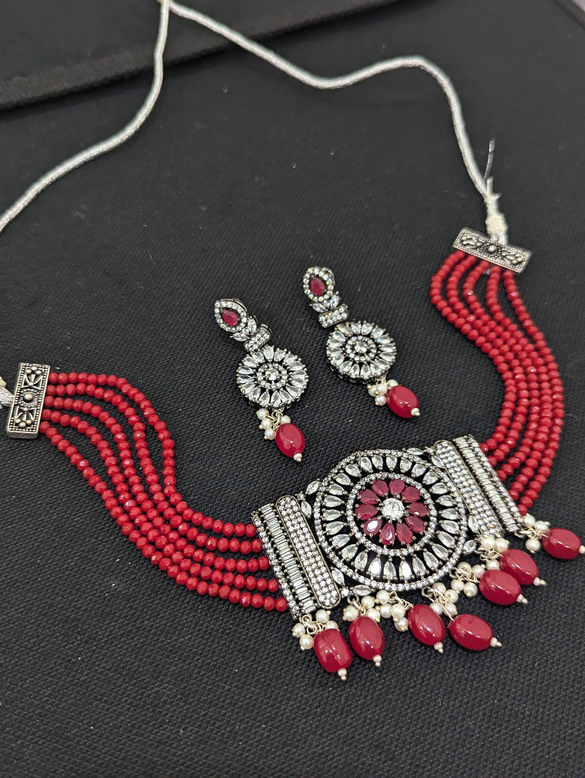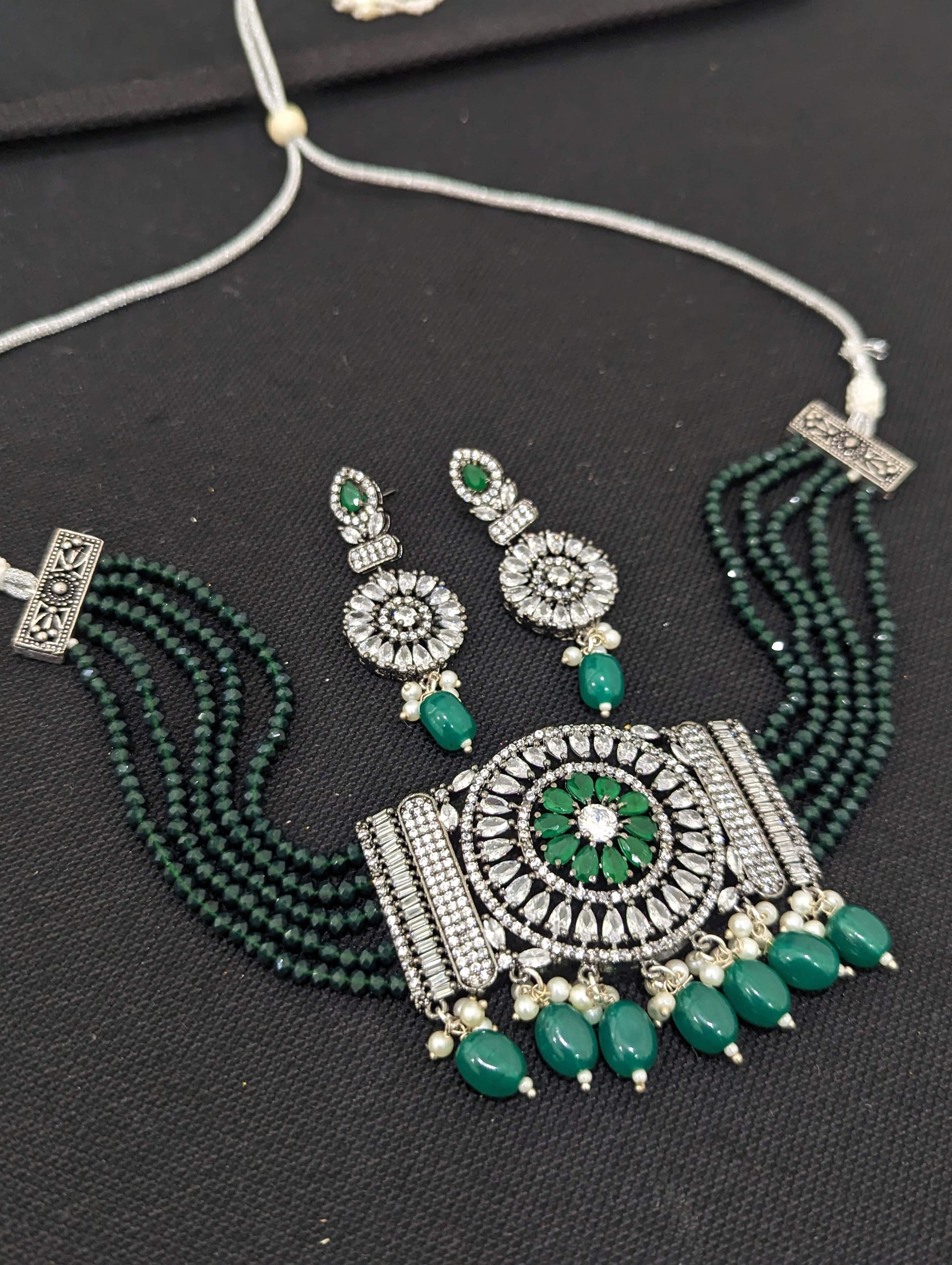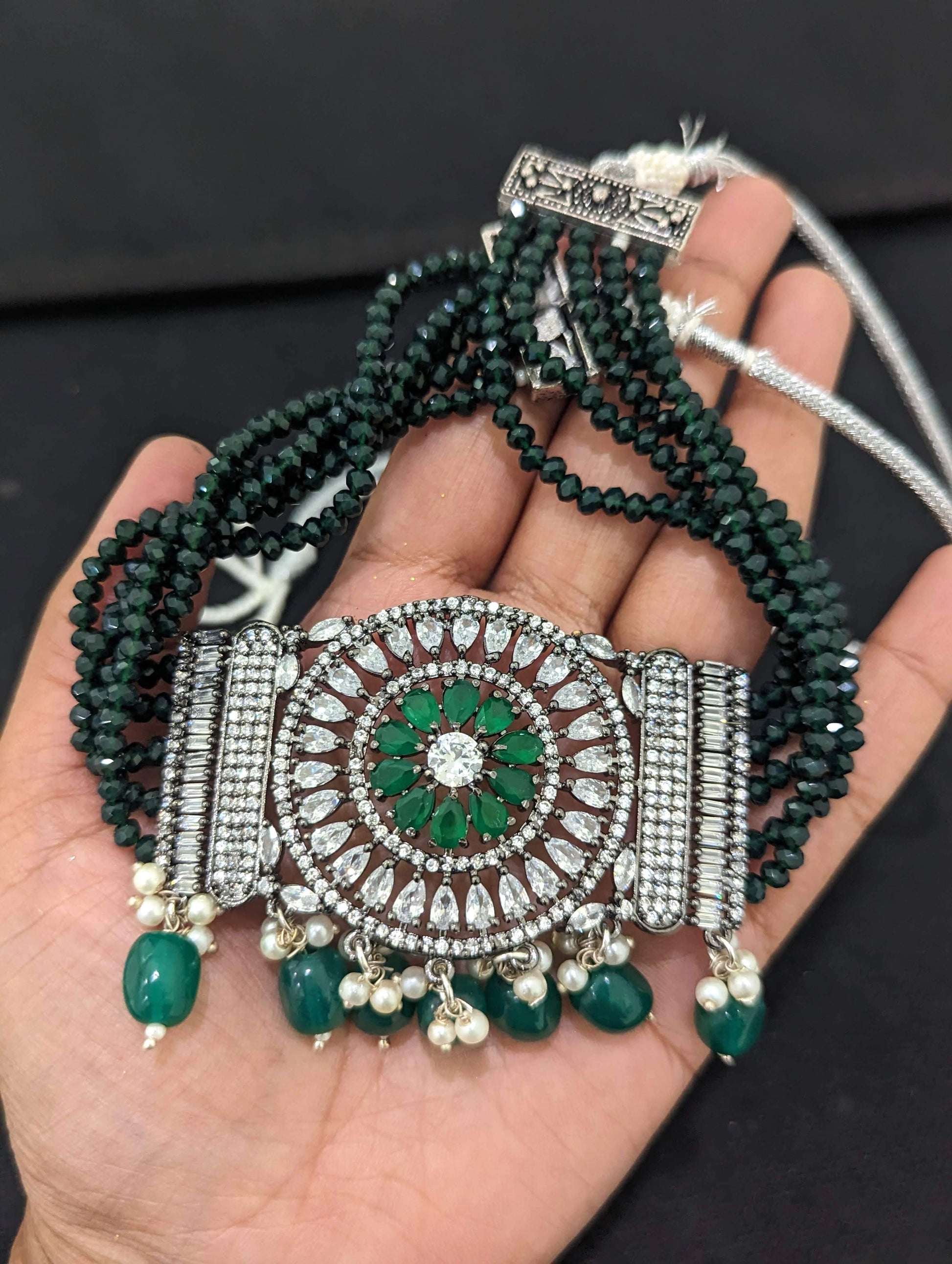 Black rhodium polished center piece with shiny crystal bead necklace.