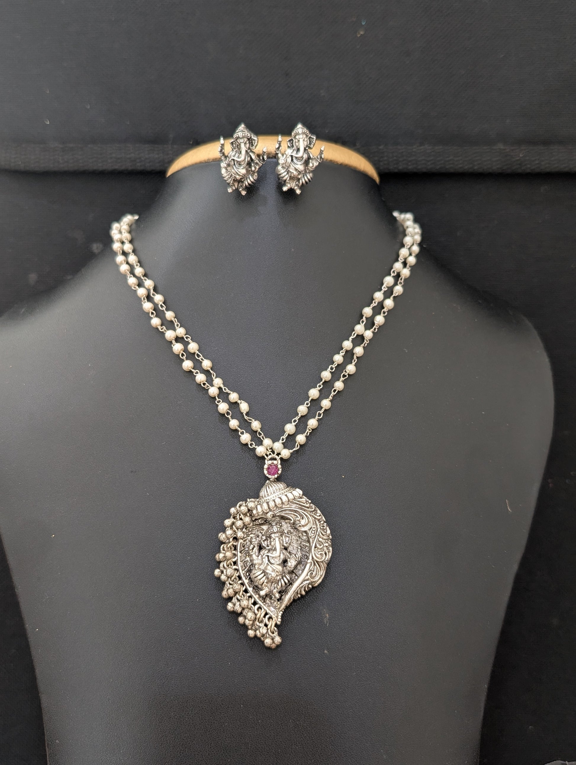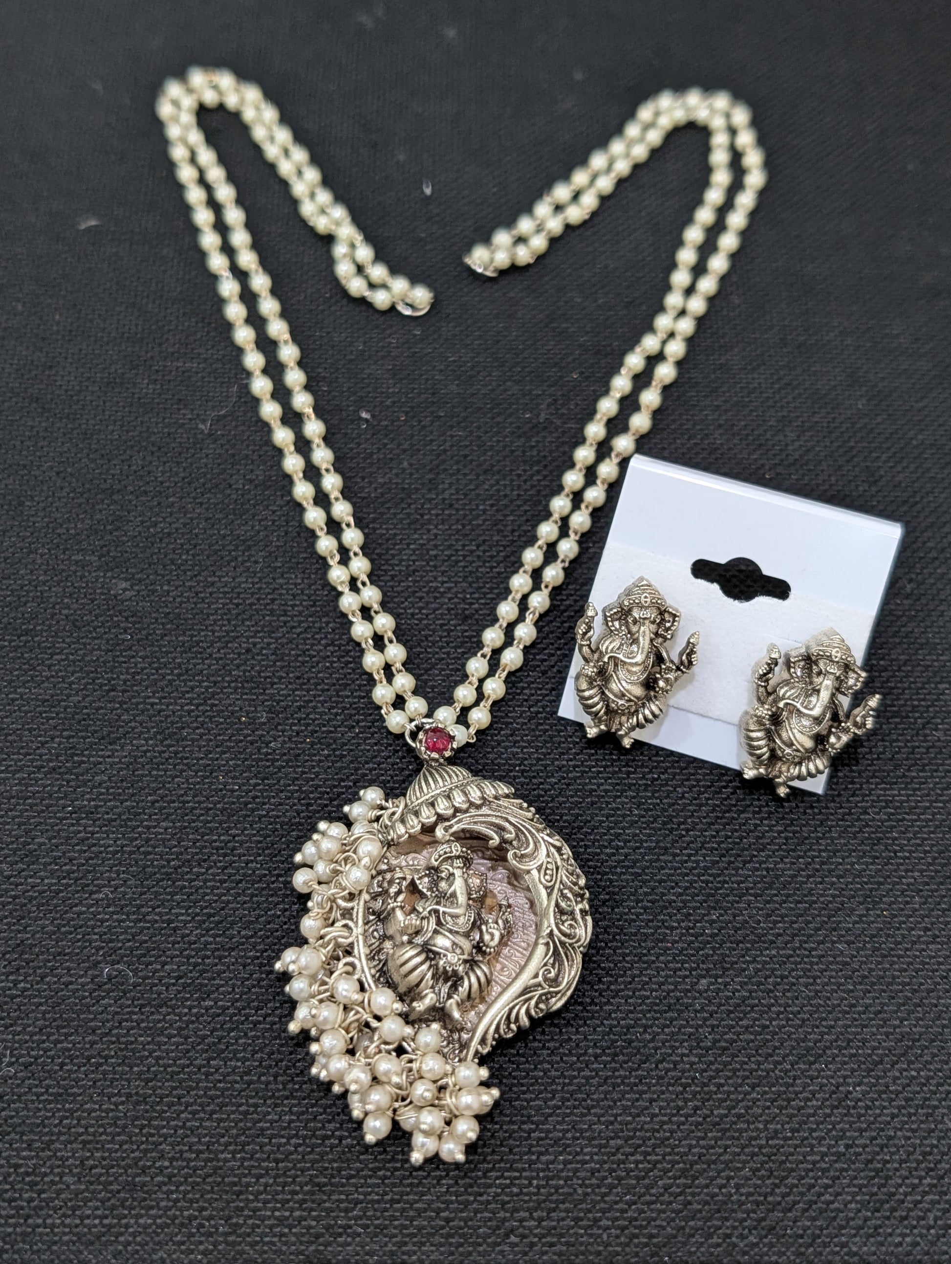 Pearl cluster / Silver bead cluster dangle Ganesh ji Pendant set.