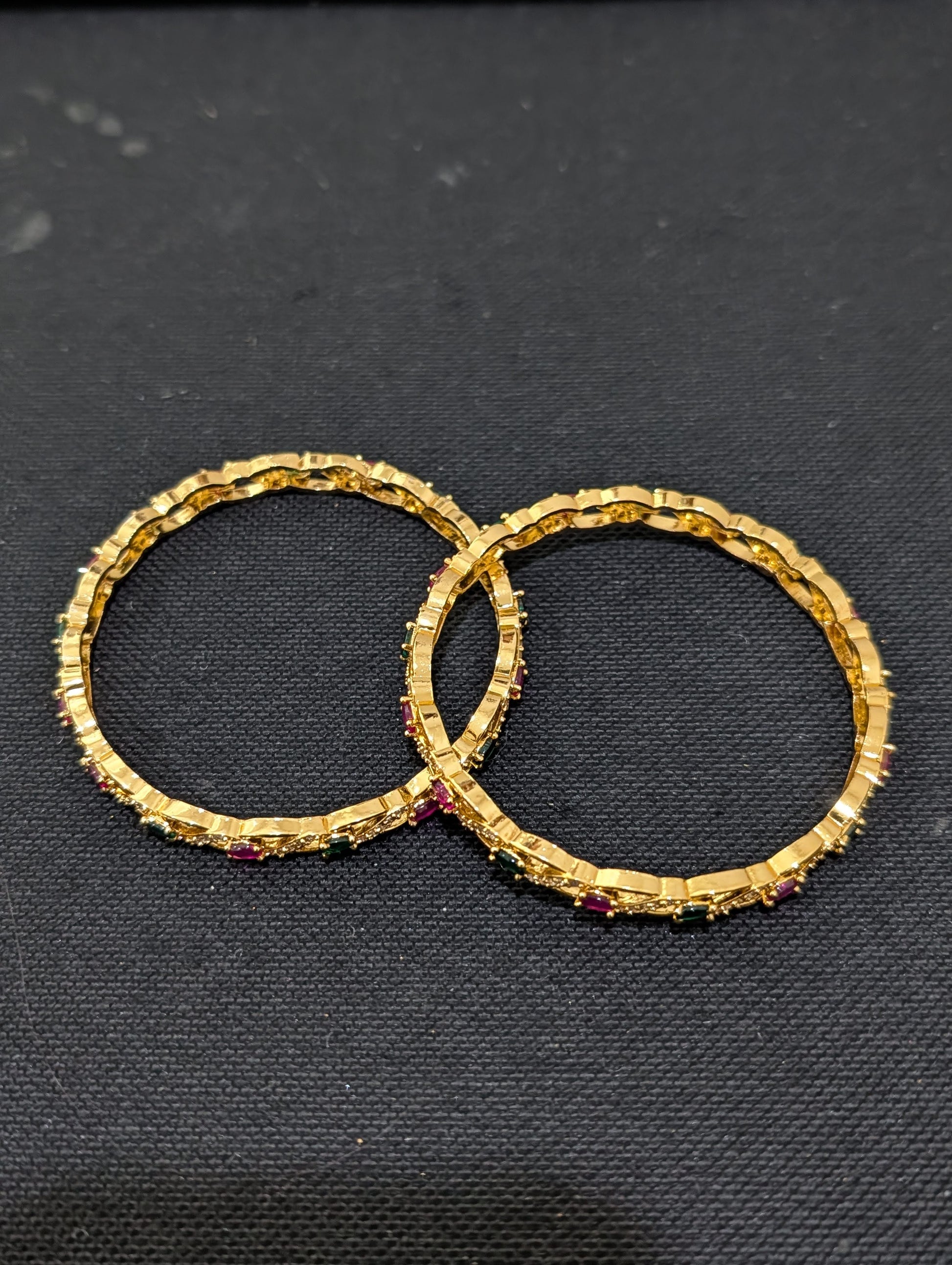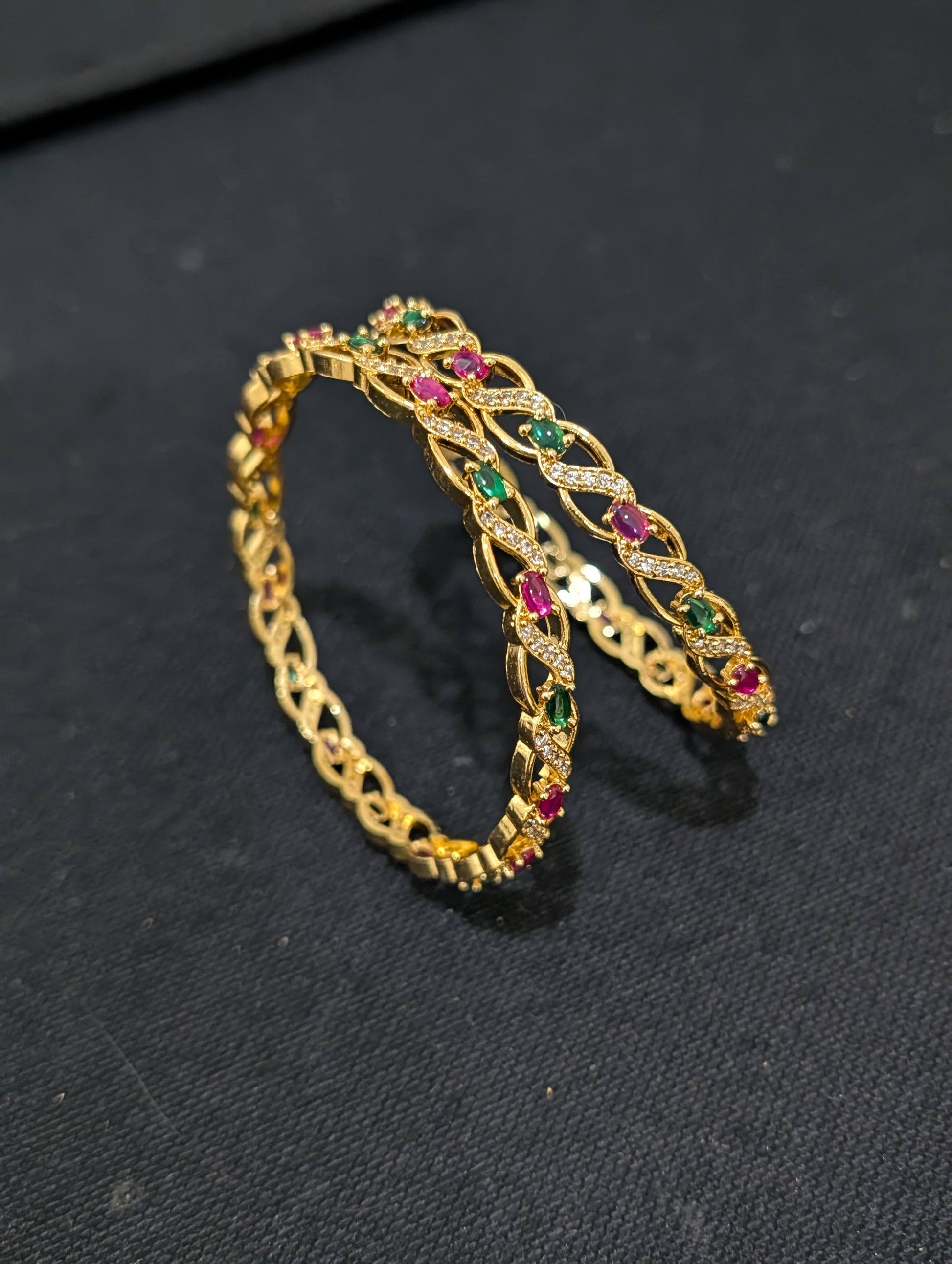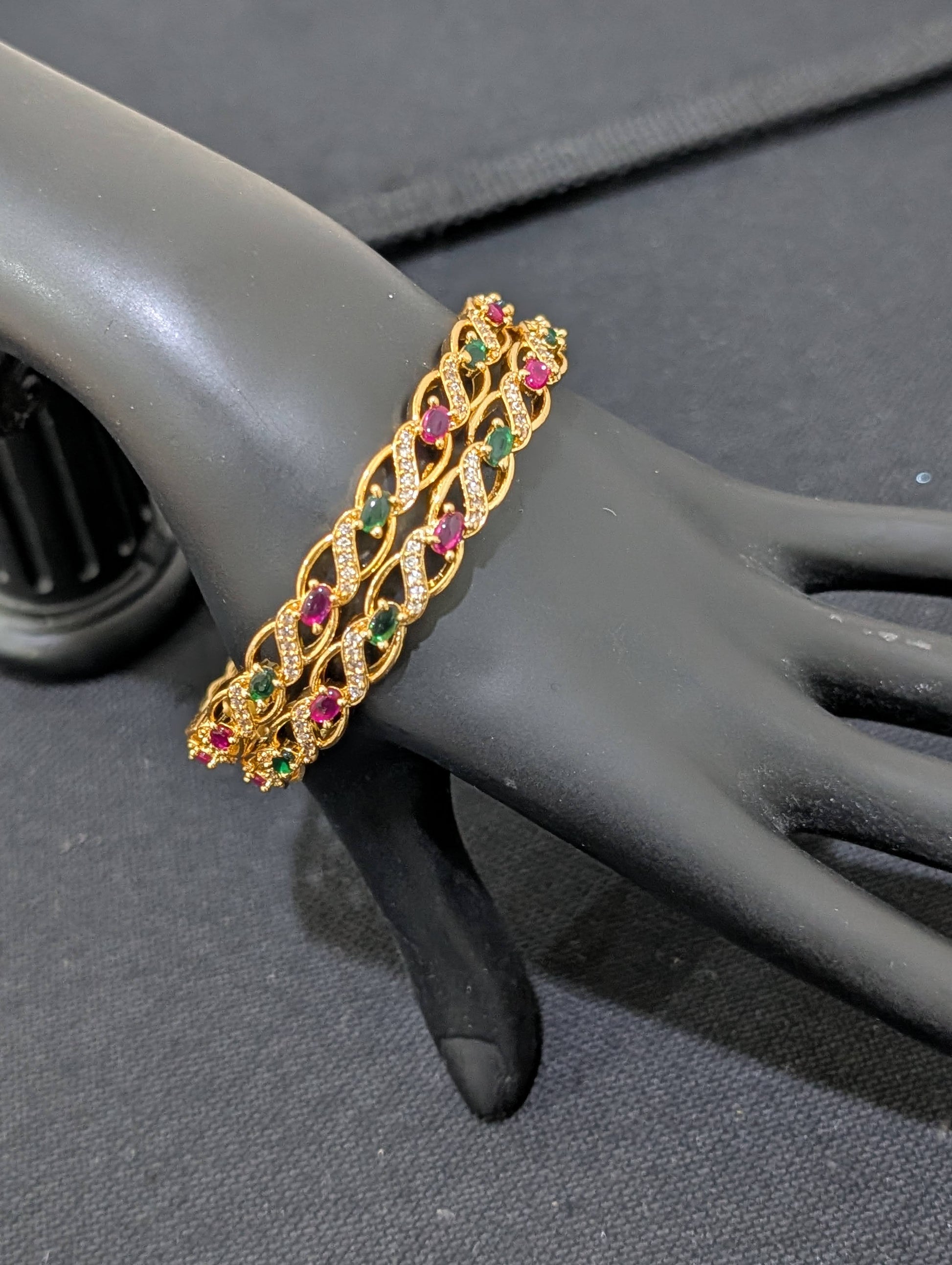 Ruby Green White CZ stone embedded one gram gold polished bangles.