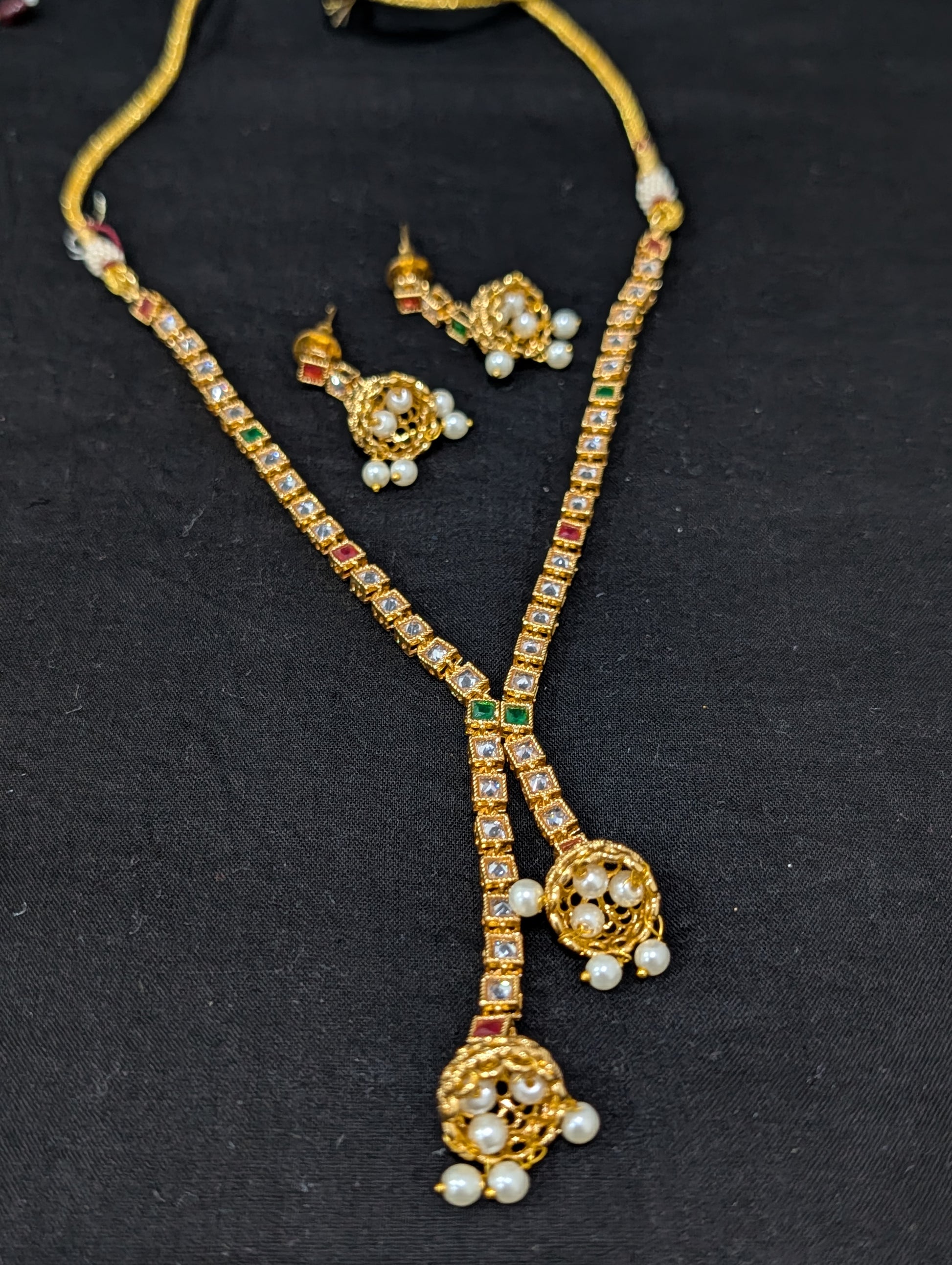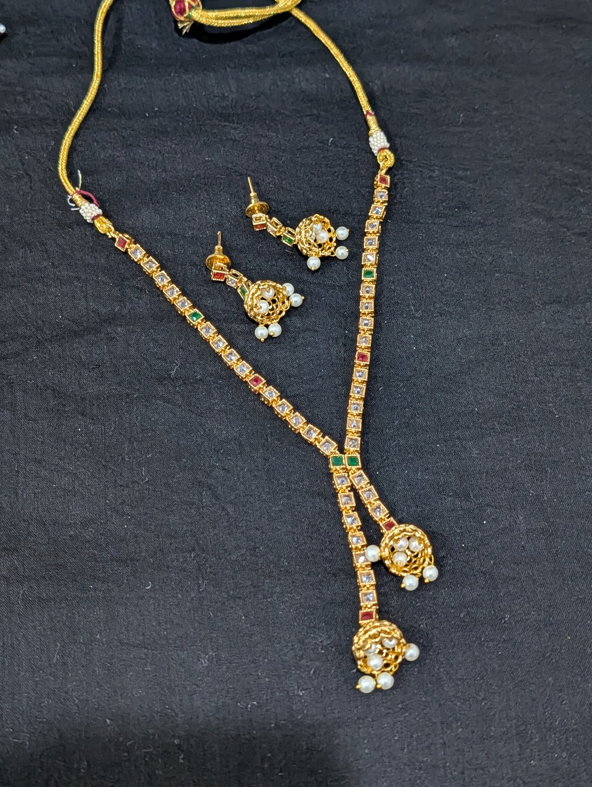 Shiny honey yellow / Ruby / Green polki stone pasted jhumka dangle Choker set.
