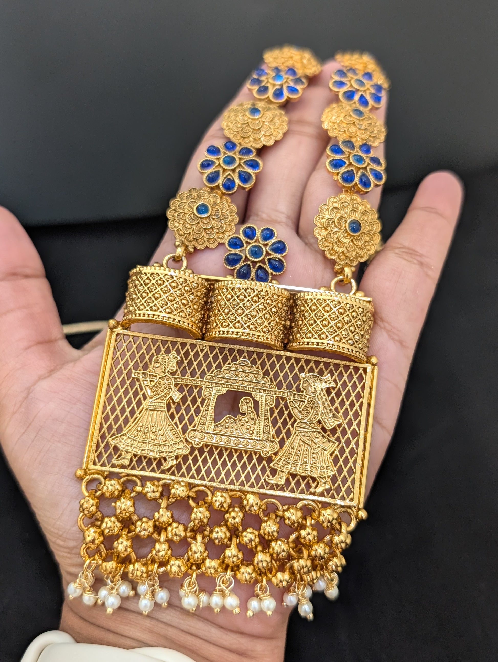 Necklace comes with adjustable gold jari cord.